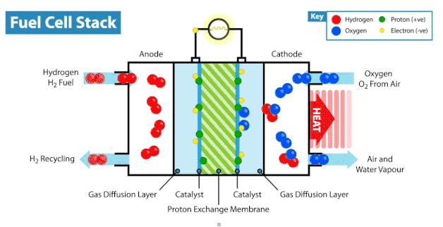 氢燃料电池工作原理是氢气通过燃料电池正极当中的催化剂(铂)分解成电子和氢离子(质子)。其中质子通过质子交换膜(Proton Exchange Membrane)到达负极和氧气反应变成水和热量。对应的电子则从正极通过外电路流向负极产生电能。