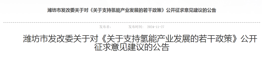 2024年11月27日,潍坊市发改委发布了《关于支持氢能产业发展的若干政策》的征求意见稿(以下简称《政策》)。