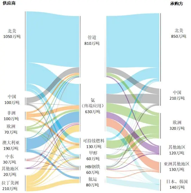 2023年1月至11月我国绿氢项目 在终端需求方面,除对化石能源合成氨及制甲醇产能替代外,随着欧盟碳排放交易体系(EUETS)等一系列“碳税”政策落地,以绿色甲醇和绿色航煤为代表的绿色燃料在海运和航空等领域的应用需求正在变得愈发迫切。 2023年2月欧盟理事会正式批准航运业纳入欧盟碳排放交易体系,即自2024年起,5000总吨及以上商业客船和货轮将按其碳排放的40%缴纳碳配额(航运公司首次缴纳期限为2025年9月30日前),且这一比例将在2025年和2026年分别提升至70%和100%,并可能在2026年将范围扩大至400总吨及以上商业船舶。 对此,马士基、赫伯罗特、地中海航运、达飞轮船、ONE等航运巨头相继公布了其EUETS附加费征收标准,长荣海运和中远海运集运两家中国航运龙头公司也分别于2023年11月16日和11月18日公布了其EUETS附加费征收标准,以亚洲至西北欧航线的20英尺集装箱为例,两家航运公司将分别收取27欧元和28欧元的EUETS附加费。根据中远海科预测,到2026年,我国欧盟航线缴纳碳税将高达38.17亿元。 高额的税费压力推动航运公司加速开展低碳转型,绿色甲醇等绿色燃料需求随之快速增加。据不完全统计,目前全球绿色甲醇船舶订单已超过200艘,预计到2027年新增绿色甲醇燃料需求将超过600万吨/年。全球各大航运公司积极寻求绿色甲醇供应伙伴,2023年11月3日,中远海运与中广核签署了年产百万吨绿色甲醇产销一体化项目战略合作协议;2023年11月22日,国际航运巨头马士基与金风科技签署签署商业可行、年产50万吨的长期绿色甲醇采购协议。 积极的市场预期和强烈的市场需求,叠加传统产能的低碳转型提质增速,驱动我国绿色甲醇项目投资规模快速扩大,2023年9月至11月期间,我国新增绿氢制甲醇项目规划总投资规模达442亿元,占2023年1月至11月新增绿氢制甲醇项目规划总产能的51.1%。 在能源贸易转型方面,绿氢作为清洁低碳的能源载体,是未来能源贸易的重要组成部分。全球各主要国家和地区加紧开展基于管道输氢、液氢、绿氨、绿色甲醇等多种形式的氢能贸易模式探索,其中,氨凭借其载氢效率高、易于液化、储存和运输成本相对较低等优势,将在未来氢能贸易中扮演重要角色。预计到2030年氢能国际贸易和国内长距离贸易量将达到1800万吨/年,其中约630万吨氢将采用氨作为载体(约合3570万吨绿氨),占氢能总贸易量的27.7%。