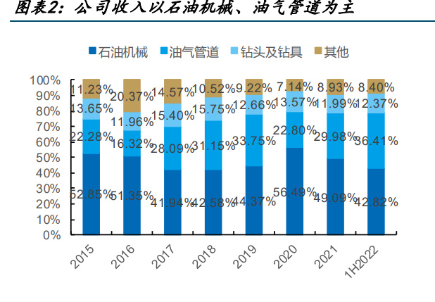 报告:国企改革释放业绩弹性,氢能布局前景广阔发表时间:2024-04-02 09:59 1.油气装备龙头,利润逐渐回暖 1.1 公司为油气装备龙头,21年利润开始回暖 公司为中国石化的油气技术装备研发、制造、技术服务企业,产品以各类油气开发装备为主,产品涵盖石油工程、油气开发、油气集输三大领域,覆盖陆地和海洋油气田,具体包括石油钻机、固井设备、压裂设备、修井机、连续油管作业设备、带压作业设备、钻头钻具、井下工具、油气输送钢管、天然气压缩机、油田环保装备、高压流体控制产品等。 公司收入以石油机械、油气管道为主,石油机械贡献主要毛利。1H22公司石油机械与油气管道贡献79.23%收入,油气管道毛利率较低,毛利主要由石油机械贡献。
