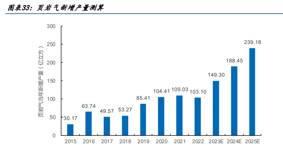 3.3 国内页岩气、页岩油开发力度有望持续加大,带动钻完井设备需求提升 22 年页岩气产量达到240亿方,伴随天然气产量增长有望保持持续增长。根据国家能源 局数据,22年中国页岩气产量达到240亿立方米,较2018年增加122%。根据国家能源局《中国天然气发展报告2022》数据,22年预计中国天然气产量2200亿方左右,力争全年增产超过100亿方。22年3月22日《“十四五”现代能源体系规划》发布,规划对油气产量做了明确要求,力争天然气产量2025年达到2300亿立方以上。 对于页岩气产量的远期预测,我们结合《页岩气发展规划2016-2020》展望的2030年实 现页岩气产量800至1000亿立方,与中国页岩气当前勘探开发、技术进步、设备总体形式预测,预计25年页岩气产量有望占到天然气产量的15%,即页岩气产量在25年达到460亿方,22至25年CAGR22.62%。 页岩气井完井后产量每年均会出现衰减,假设页岩气井完井后的第2至第8年年产量分别衰减50%、30%、20%、20%、10%、10%、5%,根据历年完井井口衰减后的产量与当年产量的差值,可以测算出为确保实现当年产量需要新增页岩气产量。