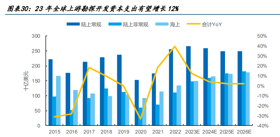 3)2023年度经济增加值(EVA)指标完成情况达到中石化集团下达的考核目标,且△EVA >0。根据我们测算,预计公司23/24年△EVA分别为0.46/0.61亿元,EVA持续增长。 3.石油机械:油公司资本开支提升,行业景气度回暖 3.1 公司石油机械板块收入以钻完井设备为主 公司石油机械板块主要包括中石化四机石油机械有限公司(以下简称四机厂)、四机赛瓦 石油钻采设备有限公司(以下简称四机赛瓦)、中国石化机械三机分公司(以下简称三机 厂)。21 年四机厂与四机赛瓦合计贡献了公司约 44%营收。 产品以压裂设备、钻井装备、固井装备、修井装备等钻完井设备为主。 3.2 23年全球上游勘探开采资本开支有望增长,油服设备行业景气度继续提升 油价挂钩三桶油资本开支,进而决定国内油服行业景气度。2014、2015年国际油价的低位运行带来三桶油资本开支大幅削减,整个油服行业景气度也随之下行,2020年一度出现的负油价再次让油服行业景气度处于低谷,三桶油资本开支缩减并严格管控成本,21年后伴随油价回暖,三桶油资本开支重回增长。 22年三桶油资本开支实现增长,23年三桶油资本开支有望进一步提升。一方面我们认为, 中国原油、天然气对外依存度较高,为响应国家能源安全战略,“十四五”期间资本开支有望保持增长;一方面目前原油、天然气价格依旧维持高位,油公司利润高增长,资本开支有望继续增加。中海油目前已发布23年资本支出规划,预计23年资本开支为1000-1100亿元,同比增长0%-10%。 根据HIS Markit预测数据,预计23年全球上游勘探开发资本支出总量相比22年增长12%。