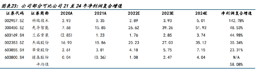 2.3 推限制性股票激励计划,经营有望进一步向好 23年3月7日公司发布22年限制性股票激励计划(草案修订稿),授予价格为每股4.08元,拟激励对象不超过190人,拟授予的限制性股票数量不超过1600万股,占公司股本总额1.7%。预留100.8万股,占授予总数的6.3%。 公司限制性股票解除限售考核条件分别为: 1)23至25年EOE(EBITDA/平均净资产)不低于19.9%,且不低于对标企业75分位值水平或同行业平均水平。我们预计公司23、24年EOE分别为20.52%/23.02%(剔除定增融资 带来的净资产增加)。 2)以2021年为基准,23至25年净利润复合增长率不低于15%,且不低于对标企业75分位值水平或同行业平均水平。 从部分有Wind一致预期的公司看,21至24年净利润复合增速5家企业平均值为54.85%, 其中兰石重装、先导智能预计复合增速分别约为45%、49%,科瑞技术高达143%,考虑其 余企业中仍有企业有望实现高复合增速,公司要超过75分位值水平(高于第五)预计净利润复合增速较高,我们预计公司21至24年净利润复合增速为49.69%。