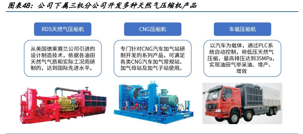 6)液氢加氢站:采用液氢技术后,储氢能力和加氢能力大幅提升,伴随氢液化技术持续发展,有望成为新的发展方向。 根据《我国加氢站建造趋势分析》统计数据,我国加氢站日加注能力主要集中在500至1000KG/d,21年新增的近百座加氢站中根据公开信息能够搜索到的已建成或投运的51座加氢站中,独立加氢站占比约为45%。 日加注能力在1000-1200kg/d的加氢站总投资额约为1800万元,设备投资额700万元。 根据《我国加氢站建造趋势分析》(文章收稿日期22年4月)统计数据,占地5000㎡的1000-1200kg/d的加氢站总投资额约为1800万元,其中设备投资额约为950万元。 按照中石化要达到规划建设600至1000座加氢站目标,未来需要新建602至902座加氢站,假设单站加注量为1000kg/d,设备投资额950万元,对应潜在设备市场空间57.19至85.69亿元。 4.3 公司紧跟中石化氢能布局,形成加氢站成套装备解决方案能力,后续有望受益中石化 加氢站建设 22年3月公司氢能装备分公司成立揭牌仪式,氢能板块布局加码。在氢能领域,公司致力打造中石化氢能产业关键装备的研发、制造和服务基地。根据公司公告信息,公司围绕供氢中心、加氢站建设提供压缩机、卸气柱、顺序控制盘、加氢机、站控系统等装备,同时围绕加氢站建设可提供“一站一策”解决方案力。同时,公司正在开展制氢装备、输氢管线等规划和研究,有望受益中石化加氢站建设。 公司下属三机分公司1982年进入压缩机市场经验丰富,产品包括RDS系列天然气压缩机、 CNG系列天然气压缩机等,产品可用于油气井增产作业、CNG汽车加气站,主要应用于中石化、中石油、中海油及地方用户市场。