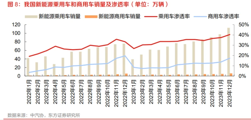 化工:应用成熟场景广泛,构成稳定存量市场全球范围内,炼油用氢当前在终端需求中占比最高。在石化行业,氢气被广泛用于对石脑油、粗柴油、燃料油、重油的脱硫,石油炼制,催化裂化以及不饱和烃等的加氢精制。在所有终端应用场景中,炼化行业目前的氢需求量最大,2022 年全球用氢需求约为 4100 万吨。随着全球石油需求保持在当前水平,炼油用氢需求将在未来几年继续存在;长期来看,尽管石油需求存在下降趋势,但由于对燃料的空气质量标准更加严格,因此炼化行业对氢的需求或将得以维持。 合成氨和合成甲醇构成全球近 5000 万吨化工用氢需求。氢气是重要的工业气体,氢元素的强还原性被用于多种化学反应,也是众多化合物的基础元素之一,化工行业需要用氢制备甲醇、合成氨等多种产品,2022 年全球用于合成氨和甲醇生产的氢气分别约为 3300 万吨/1600 万吨。而氨贸易在全球范围内进行,全球出口量约占总产量的 10%,因此作为重要的氢衍生物,氨的全球运输和贸易将成为未来氢生态系统的重要推动力。合成氨也是当前国内对氢需求量最大的应用场景, 占国内氢总需求量的 31%,其次是甲醇合成(23%)和作为燃料直接燃烧(15%)。 冶金:钢铁工业深度脱碳的重要途径氢可替代煤、焦,实现钢铁行业的深度脱碳。钢铁行业是碳排放密集程度最高、脱碳压力最大的行业之一,碳排放约占全球排放总量的 7.2%。作为世界粗钢第一大生产国,我国粗钢产量占世界 的一半以上,2022 年产量约为 10.2 亿吨,全国钢铁行业的碳排放量占全国排放总量的比例约为 15%。当前我国主流的钢铁生产工艺是高炉-转炉长流程,以煤炭作为主要热源和还原剂,较高的碳排放强度无法避免,且基于当前传统工艺技术的创新改进难以实现深度脱碳。而氢冶金用氢替代焦炭进行直接还原铁生产并配加电炉炼钢,既减少了钢铁工业对煤、焦炭等化石燃料的需求,也避免了炼铁过程大量碳排放的产生,将成为钢铁行业完全脱碳最具前景的解决方案之一。 氢冶金技术仍处于探索和示范阶段,高炉富氢技术或将率先推广。较低碳排放的技术包括废钢电炉冶炼短流程、高炉富氢冶炼、氢基直接还原铁(DRI) + 电炉工艺等。其中,高炉富氢冶炼由于改造成本较低、富氢气体易获取,可操作性强,被认为是现阶段“碳冶金”到“氢冶金”的重要过渡,其潜在碳减排幅度为 10%-30%。而氢基直接还原铁技术采用氢气代替一氧化碳作为氧化铁的还原剂,还原反应生成的是水而非二氧化碳,因此是最具发展潜力的低碳冶金技术。但目前尚处于研发试验阶段,预计具备大规模推广条件需要等到 2040 年之后,同时还取决于绿氢产业链的发展。目前,全球每年有近500万吨的氢用于钢铁生产中的还原反应,随着氢冶金技术的进步及装置改造的推进,钢铁行业的氢需求量有望进一步提升。根据 NRDC 和 CSDRI 的预测,到 2030/2050 年,我国钢铁行业对氢的需求将达到 290/713 万吨。 能源领域:贡献未来主要需求增量氢作为能源使用比例较低,发展空间广阔。氢易燃且热值高,燃烧产物仅为水,不排放二氧化碳等温室气体,与传统的化石燃料相比,是终端零排放的清洁能源。然而目前能源用氢在全球范围内都尚为有限。以中国为例,2022 年全国氢气产量超 3500 万吨,其中用于交通和建筑的能源的比例不足0.1%,按热值换算仅占能源消费总量的 0.002%。而为了实现《巴黎协定》中的目标, 氢需要在 2050 年左右满足世界能源需求的约 15%,因此能源用氢需求空间广阔。 考虑氢主要作为能源载体的场景,下游应用可以分为交通动力和固定非动力两大类。目前来看, 氢能将以燃料电池汽车为主要终端应用,以动力和电力为两条主要线索,纵向深挖交通领域持续 探索新的场景,同时横向往储能、建筑、发电等能源需求部门探索。 交通:重型车辆加速渗透,航空航运开辟用氢新场景重型交通能耗大、碳排高,转型进程缓慢。重型交通是交通运输领域的重要组成部分,但温室气体和污染排放占比大,我国中重型车辆以 5% 的保有量排放了道路交通领域 84% 的颗粒污染物。 重型交通设备普遍采用柴油发动机,对动力系统的稳定性、经济性等要求更高,为了实现零碳排 放所需要付出的改造、燃料等额外成本更高。相较于乘用车新能源渗率稳步提升,重型交通领域 转型路径仍存在较大争议,推进缓慢。截至2023年底,我国新能源乘用车的单月渗透率已经达到 40%,而商用车市场中新能源渗透率仍仅 17%,全球范围内中重型车辆的绿色转型则更为滞后。
