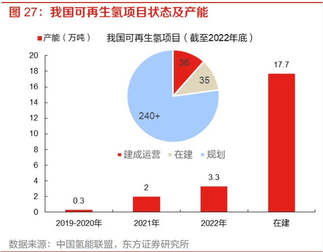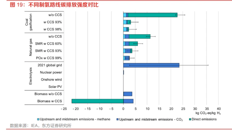 我们认为,未来对氢的需求主要来自三个方面: 一是传统工业领域的用氢需求,即主要来自炼油、合成氨及合成甲醇的需求,预计将保持相对稳定,其中炼油用氢可能随着石油需求量下降而有所下降。整体而言,根据 IEA的预测,在 2050净 零排放场景下,2030 年炼油、合成氨及合成甲醇对氢气的年需求量合计将接近 9000 万吨。 二是氢及其衍生物作为燃料的应用需求,即氢作为能源载体替代化石燃料带来的需求,既包括在交通领域的动力需求、建筑领域的供热需求,也包括参与发电的电力需求。根据 IEA 的预测,在 2050 净零排放场景下,2030 年交通和能源行业的氢需求量将分别达到 1600 万吨和 2200 万吨。 三是氢在新应用场景中的需求,如氢储能,在新场景中的推广程度既要靠相关技术发展赋能,也依赖于产业起步后用氢成本的下降。中短期内,新场景应用带来的需求提升十分有限,但长期来看可能撬动更大潜在空间。 综合来看,IEA 预计 2030/2050 年全球氢气年需求量有望达到 1.5 亿吨/4.3 亿吨,其中能源和交通部门将贡献最主要增量。 制氢:供给结构亟待变革,绿氢迎来发展机遇化石能源制氢:构成当前供给基本盘化石燃料制氢为当前全球主流制氢方式。化石燃料制氢是以煤或天然气为原料还原制氢的传统方案,技术成熟、成本最低。根据 IEA 数据,2022 年全球氢气产量达到近 9500 万吨,其中化石燃料制氢占比超过 80%,包括天然气制氢(62%)、煤制氢(21%)、石油制氢(0.5%)。与全球制氢结构相比,基于“富煤、贫油、少气”的资源禀赋,国内目前以煤制氢为主,也是世界上唯一具备大规模煤制氢产能的国家。据中国氢能联盟统计数据,截至 2023 年 6 月,我国氢气产能约为 4952 万吨,其中煤制氢产能为 2709 万吨,占比 54.7%,其次为天然气制氢,产能约 1090 万吨,占比 22.0%。 碳捕集利用与封存(CCUS)技术可以有效降低碳排放,但将大幅抬高制氢成本。化石燃料制氢碳排放强度高,随着碳排放指标进一步收紧,新增化石能源制氢产能将逐步缩减。利用碳捕捉、 利用与储存技术(CCUS)可以实现低排放生产,被称为“蓝氢”。目前全球仅不到 1% 的氢以蓝氢的形式生产,截至 2022 年,全球有 16 个制氢设施配备了 CCUS,其中超过半数都位于北美。 从经济性角度衡量,CCUS 会增加额外的投资成本与运营成本,根据 IEA 测算,采用 CCUS 后, 煤制氢的平准化成本将从 7-11 元/kg 增加至 9-20 元/kg,天然气制氢的平准化成本将从 9-18 元/kg 增加至 13-24 元/kg。但考虑到我国已有 3800 万吨规模的化石燃料制氢产能,耦合 CCUS 是对该 部分存量制氢产能低碳化的重要手段,在二氧化碳储存能力高、化石燃料成本低、可再生资源有限的地区,采用 CCUS 的化石燃料制氢在中期内仍可能是一种具有综合经济效益的选择,将构成氢供给侧的重要组成部分。 工业副产氢:来源丰富成本低廉的补充性氢源副产氢的主要来源是炼油、煤焦、钢铁和化工。工业副产氢来源丰富,在我国和世界制氢结构中分别占据 21%和 16%的份额。而考虑制氢过程原材料获取排放、工艺排放和能源使用排放,工业副产氢的碳排放量普遍低于化石燃料制氢,我国工业副产氢产能分布与能源负荷中心也高度重合, 因此综合考量下可以作为中短期内可行的供氢方案。 炼油行业:催化重整和蒸汽裂解均会产生副产氢,但这些氢气均在现场消耗用于石油馏分的脱硫和加氢裂化,无法转作他用。 钢铁行业:产生的焦炉煤气为富氢气体,含氢量可达 55%-60%,其中的氢可以通过变压吸附法回收。按照 2019 年国内焦炭产量 4.71 亿吨计算,焦炉煤气中超过 700 万吨/年的副产品氢气可通 过技术手段回收。这些氢气目前用作炼钢和甲醇生产的原料,以及区域供热。 化工行业:氯碱电解是唯一副产纯氢的来源。由于烧碱行业的高耗能、高污染特性,区域氯碱产 能扩张受到限制,但下游需求增加导致产能仍在缓步增长;截至 2023 年 6 月,我国氯碱副产氢产能达到 117 万吨/年。此外轻烃化工在丙烷脱氢、乙烷裂解等过程中也可产出副产氢,截至 2023 年 6 月,我国轻烃化工副产氢产能达到约 130 万吨。 工业副产氢回收利用投入较低,但规模扩张受到主产品限制。与专门的氢气生产相比,回收副产氢所需的投资低、额外能源少,而且大多数富氢废气只需进行脱水或其他类型的清洁处理。且就我国而言,副产氢主要分布在沿海发达地区,这些地区同时也拥有包括燃料电池制造在内的下游 产业,将大大降低副产氢再利用的储运难度。因此,挖掘利用副产氢不仅能提高资源利用效率, 还能有效减少碳排放。但由于副产氢的生产规模受到主产品规模的限制,可作为氢源的有效补充。 电解水制氢:脱碳转型最优解,发展空间广阔绿氢是实现净零排放的最优方案,当前规模较小仍处于发展早期。绿氢指通过可再生能源电解水制备生产的氢。目前全球范围内,电解水制氢仅占全部氢产量的 0.1%。国内电解水制氢产能占比为 1.3%,但大部分为网电制氢,而电网电力供应大部分来自火电厂,网电制氢全过程的碳排放强度(24kg CO2-eq/kg H2)甚至可能高于灰氢,也远远超出我国标准体系中低碳氢(14.51 kg CO2- eq/kg H2)和清洁氢(4.9 kg CO2-eq/kg H2)的阀值。因此,实际可再生能源制氢在我国制氢产能中的占比仅 0.1%,约 6.6 万吨(截至 2023 年 6 月),相比《氢能产业发展中长期规划(2021- 2035 年)》中 2025 年可再生能源制氢产能达到 10-20 万吨/年的目标还有很