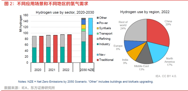 2024年氢能源行业专题报告:从氢的供需拆解探寻氢能发展方向发表时间:2024-04-28 10:23 氢:战略性脱碳能源载体,发展具有必然性减碳成为全球共识,转型脱化挑战重重。世界各国从 20 世纪 90 年代起,通过《京都议定书》、《哥本哈根协议》、《巴黎协定》等一系列文件,达成碳达峰、碳中和共识。2023 年 12 月,《联合国气候变化框架公约》首次将“转型摆脱化石燃料”写入文件。然而,摆脱化石能源面临两大关键问题:一是风光等可再生能源的占比提升意味着电力系统的不可控性加大,火电占比降低又造成了电力系统调节能力的下降;二是在重工业、重型交通等领域,电气化实现难度较大,例如钢铁、水泥、化工、航运、航空等,仍需要依靠可再生电力之外的其他清洁能源来实现深度脱碳 。氢能是增加能源系统灵活性和深度脱碳的重要手段。正如我们在《探寻氢能的定位与发展逻辑》中所指出的,氢能既是补充能源系统灵活性的优质资源,有助于解决可再生能源的波动性问题,同时连接了可再生的一次电力和终端的燃料/原料需求,有望成为实现终端深度脱碳的重要载体。 氢能在我国能源革命与低碳转型中具重要战略意义。“十四五”以来,我国氢能产业快速发展,相关政策体系随之建立健全。《中共中央国务院关于完整准确全面贯彻新发展理念做好碳达峰碳中和工作的意见》明确统筹推进氢能“制储输用”全链条发展。《“十四五”现代能源体系规划》对氢能技术创新、示范应用等进行部署。2022 年 3 月,发改委与国家能源局联合发布了《氢能产 业发展中长期规划(2021-2035)》,氢能发展正式纳入国家发展规划。《规划》明确了氢能在中国能源体系和产业结构调整和升级中的角色定位。氢能是中国绿色低碳能源体系的组成部分和“双碳”目标实现的重要途径。《规划》强调了“构建清洁化、低碳化、低成本的多元制氢体系,重点发展可再生能源制氢,严格控制化石能源制氢”的发展基调,同时针对绿氢制定了分阶段的 发展目标: 1)到 2025 年,建立以工业副产氢和可再生能源制氢就近利用为主的氢能供应体系。目标是氢燃料电池汽车产量达到 5 万辆,并建设足够数量的加氢站。可再生能源制氢产能达到 10-20 万吨/年,实现二氧化碳减排 100-200 万吨/年。2)到 2030 年,可再生能源制氢广泛应用,有力支撑脱碳目标实现,重点发展低碳出行和工业减碳。 3)到 2035 年,可再生能源制氢在终端能源消费中的比重明显提升,对能源绿色转型发展起到重要支撑作用。2023 年 8 月,国家标准委、国家发改委、工信部、生态环境部、应急管理部、国家能源局六部门联合印发《氢能产业标准体系建设指南(2023 版)》。这是国家层面首个氢能全产业链标准体系建设指南,对促进氢能产业高质量发展具有基础性、战略性、引领性作用。 用氢:工业原料广泛应用,能源载体地位凸显作为一种用途广泛的二次能源,氢能可以在多个生产和消费环节作为替代能源进行使用,而氢气 本身作为一种重要的工业气体,在传统工业领域已有非常广泛的应用,因此未来氢将同时扮演能源载体和工业原料两重角色,在重工业、交通、建筑、电力等行业中有不同的应用场景。 工业领域:集燃料、原料、还原剂于一身的重要工业气体目前,全球每年的氢气产量几乎全部用于非能源领域。根据 IEA 数据,2022 年全球氢气用量达到 9500 万吨,同比增长近 3%创下历史新高,但从应用场景来看仍然集中在传统的工业和炼油领域, 而来自运输、电力、建筑等新应用领域的氢需求量非常低,占比不到 0.1%。分地区来看,中国是全球最大的氢气消费国,年需求量占全球总量的 29%,主要的用氢地区还包括北美、中东、印度和欧洲。