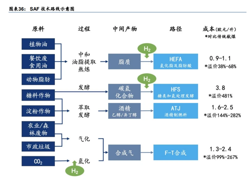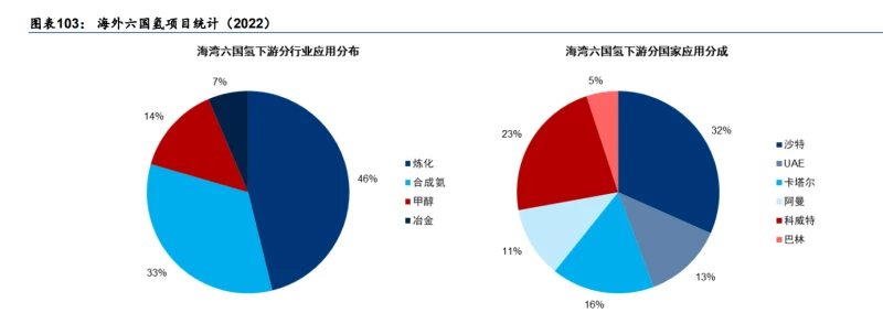 由于目前 SAF 政策从欧洲起步,且规管的是欧盟的航空燃料提供商以及欧盟境内起飞航班的燃料加注行为,因此欧盟目前 SAF 在建及规划产能体量可观。截至 2023 年末,根据 T&E 统计欧洲经济区境内共有 25 个大型和 20 个小型合成燃料 SAF 项目在推进当中(主要统计了 PtL FT 项目以及传统 Gasification-FT 项目),其中大型工业项目预计 2030 年总产能达到 170 万吨,若顺利投产则能够满足欧盟 ReFuelEU Aviation 对合成燃料 SAF 设定的 1.2% 的比例要求(对应 60 万吨合成燃料 SAF 需求)。截止 2024 年初,目前尚无大型项目达成最终投资决策,大部分项目仍处于早期阶段,包括 8 个处于前期项目立项阶段、13 个处于可行性研究阶段、以及 3 个进展较快处于前期工程阶段的项目。这三个项目为丹麦 Arcadia eFuels(67.7 千吨/年))、挪威 Norsk e-Fuel(32~64 千吨/年)和挪威 Nordic Electrofuel (6 千吨/年),T&E 预计以上三个项目有望在 2024 年底之前达成最终投资决定,并于 2026-2027 年开始生产。 乐观预计到 2030 年由 SAF 导入带来的绿氢需求量在几十万吨/年量级。结合国际航空运输协会(IATA)的预测,到 2030、35 年全球 SAF 需求达到 230、900 亿升/年(对应 SAF 渗透率接近 5%、19%),参考欧盟 ReFuel Aviation 设计,到 2035 年 SAF 燃料技术路线或由 25%合成 SAF/75%其他 SAF 构成,对应 PtL -FT-SPK 路线 SAF 的需求到 2030、35 年分别达到 46、225 亿升,基于绿氢单耗 0.17kgH2/kgSAF,有望带来约 60、300 万吨/年的绿氢需求。 2 绿氢化工可能率先平价 化工领域是目前氢利用最大的产业,氢作为原料主要集中在石油炼化,甲醇和合成氨三个板块。综合来看在化工领域,我们认为合成氨市场空间最有可能被打开,其次是甲醇和炼化氢,且合成氨作为氢当前最成熟的长距离、长时间储运载体,因此将最先出现绿氢产业化替代。首先绿氨的平价成本在不考虑碳税的情况下可以在 10 元/kg 在绿氢需求平价线中处于相对较高的水平,且合成氨的下游需求中有 50%的流程需要氨外采,因此氨本身也是一个存在全球贸易的化工品,一旦平价即可顺利切入产业。同时液氨本身储氢量比液氢高 50%,具备更低的运输和液化难度、更成熟的产业链支持,使其可能成为目前全球氢跨境运输产业链的首选。考虑绿氢的全球贸易拉动氨额外储运运输需求,带来绿氨合成产业化更快加速。除此之外,我们认为无论是炼化用氢、合成氨还是合成甲醇,绿氢在炼化化工领域的替代均还需考虑波动间歇式新能源电力输入与稳定不间断化工过程的物料平衡匹配问题,我们预计绿氢产业规模化、绿氢储运体系成熟化后这一问题有望逐步改善。我们展望 2030 年炼化化工领域有望拉动合计约 620 万吨每年的绿氢需求,而氨的相关储运设备需求可能上升四倍。 2.1 化工是氢重要的存量应用场景 全球氢存量需求主要来自化工。2022 年全球氢市场需求 9500 万吨主要由化工相关领域贡献,包括炼化 4100 万吨,合成氨 3180 万吨,合成甲醇 1590 万吨。 相比长流程化工,短流程化工绿氢替代工艺壁垒相对更低。长流程物料平衡、输入输出更为复杂,炼化、合成氨、合成甲醇领域的长流程比例各不相同,其中: 炼化领域,根据 IEA 约 80%的炼化用氢为本地自产,其中 55%为在地天然气重整制氢(短流程,绿氢工艺角度可替代),45%为石脑油裂解副产氢(长流程,绿氢工艺角度较难替代)。合成氨领域,最大下游尿素(占全球合成氨需求的约 50%)几乎 100%为煤制/气制合成氨-尿素一体化产能,其中煤气化/天然气重整生成的 CO/H2 合成气中 C/H 元素均进入尿素生产流程,是为一体化长流程,绿氢替代制备绿氨则需寻找外部碳源,从工艺角度来说替代所需改变流程较多。合成甲醇领域,国内合成甲醇重要下游烯烃(占全球甲醇需求约 15%,产能主要集中于国内)约 70%甲醇制烯烃产能为一体化产能(MTO),然一体化主要系降本考虑, 非物料平衡,因此从绿氢替代工艺难度出发看相对容易。此外 MTBE(汽油增氧剂,占全球甲醇需求约 10%)几乎均为甲醇-MTBE为一体化长流程。 七部委首提“推广短流程工艺技术”为绿氢切入化工流程打开入口。2024 年 2 月 6 日工信部联合七部委发布《工业和信息化部等七部门关于加快推动制造业绿色化发展的指导意见》,提出推广钢铁、石化化工、有色金属、纺织、机械等行业短流程工艺技术。到 2030 年,短流程炼钢比例达到 20%以上,合成气一步法制烯烃、乙醇等短流程合成技术实现规模化应用。 除长短流程的工艺变化以外,绿氢在炼化化工领域替代还需考虑大化工连续生产以及清洁碳源匹配问题。一方面,化工装置运行涉及复杂的物料平衡,往往要求装置连续稳定不间断运行,如何实现波动间歇式新能源电力制氢与后道化工工艺对稳定性要求的匹配,需要考虑储电/储氢等方式及其额外成本影响,若绿氢在国内产业成规模,有望降低这方面的担忧。另一方面,绿色甲醇工艺的“绿色属性”不仅需要绿色电力制氢,还需要低碳(如高浓度工业点源)甚至碳中性(如直接空气捕捉、生物质基)的 CO2 来源。符合绿色甲醇定义的 CO2 来源问题,国内外主流国家界定标准尚不统一/尚无标准,因此甲醇绿氢替代的具体模式和可行性,还需视绿色甲醇项目目标终端市场的客户/政策要求,对应匹配 CO2来源。 2.2 合成氨绿氢平价已见曙光 全球氨需求量稳定于 1.7-1.8 亿吨,对应约 3000 万-3200 万吨的氢当量。全球氨直接贸易量占氨产量比重的约 1/10