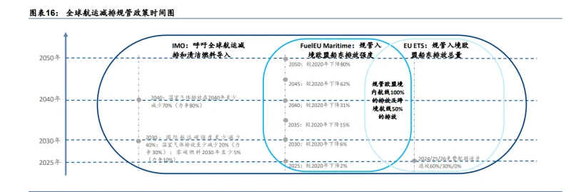 船舶减碳的技术路线多样,但零碳燃料是终极方向。目前行业公认的船舶减碳技术手段包括:1)船舶降速;2)节能设备改造;3)清洁燃料替代,其中清洁燃料包括 LNG、甲醇、 氨、氢等多种形式。从减排潜力来说,船舶降速、节能改造、LNG 的减排潜力天花板较低: 船舶降速:根据 KNOWMI,船舶减速 10%可以分别带来油船、集装箱船、干散货船 10%、13%、15%的碳减排效果。根据克拉克森,1H21 以来全球船舶平均航速持续下降,截止 2023 年初全球远洋船舶的平均航速已降至 13.8 节,同比下降 4%。一般而言远洋船舶最低航速在 12-13 节,较当前船速仅有 6~13%的下降空间,以集装箱船为例对应继续通过船舶减速可以提供的减排效果仅剩 8~17%。此外采用船舶降速方式减排还需考虑到其带来的经济成本和货主的接受度情况。 节能改造:加装节能设备(Energy Saving Devices)可以减低船舶燃料消耗并减低船舶碳排放强度,如减小航行阻力设备(推进改善装置、球鼻艏)和辅助推进系统(风力辅助推进系统)等, ESD 设备能实现 7-22%的能效提升。据克拉克森统计,截止 2023 年船用节能装置(包括螺旋桨导流罩、舵球、旋翼风帆、空气润滑等)已应用在超过 5850 艘船上,以总吨计占全球船队 25.6%。 清洁燃料:当前远洋船舶的主流燃料选择是燃料油,根据 Transport&Environment,以低硫燃料油(VLSFO)为例,其全生命周期(Well-to-Wake)碳排放强度达到 92.63gCO2e/MJ,而相比之下 LNG 的减排潜力为 16%,生物质甲醇 86%,电甲醇 70~97%,绿色合成氨 70~100%。可见甲醇及氨燃料可以实现船舶深度减排,而 LNG 总体潜力有限。 因此,对照 FuelEU Maritime 的碳排强度下降时间表,绿色燃料以外的各类减排措施(船舶降速、节能改造、清洁燃料中的 LNG)至多可满足至 2035 年前后的减排要求。中远期来看,船舶满足减碳政策目标还需依托甲醇、氨、氢等具备零碳潜力的清洁燃料形式。 清洁燃料选项中,燃料特性、设备兼容度、技术成熟度综合推动绿色甲醇成为现阶段船东公司深度减碳的首选能源。绿氨仍待技术的成熟和商业化的进展。 燃料特性:甲醇燃烧特性和重油类似,可以用双引擎直接替代。燃点和点火能量较氨具备优势,燃烧稳定,当前技术水平更容易实现,不似氨容易出现燃烧速率低(燃烧不均匀)和点火能量要求高(容易断火)的问题。 设备兼容度:与其他船运清洁替代燃料(如 LNG、氨)对比,甲醇可以在室温条件下以液态储存,其存储运输均更为简单, 不像绿氨需要在-33℃液化并存储在绝缘储罐中,而不能存储在常规的锌硅酸盐涂层储罐中。 技术成熟度:在造船经验和作为替代燃料的应用上,甲醇已经获得 3-5 年的关键领先期。甲醇船舶发动机早在 2016 就已经有应用(Waterfront Shipping),目前实证应用时间已经超过 13 万小时 。而大型氨船舶发动机 2023 年中刚进入试点测试阶段,两大主要船舶主机商 MAN 和 WinGD 预计于 2024-2025 年陆续推出大型商用船舶氨燃料发动机。 落地来看,本轮造船周期中甲醇船舶订单已开始快速增长,有望拉动船舶甲醇燃料需求在 2025-30 年间的从 0 到 1。 根据 DNV 和 IHS 截至 2023 年中数据,按总吨位计算,全球在运船舶的燃料结构为传统燃料油 93.5%/LNG 5.96%/电混动 0.26%/LPG 0.25%/甲醇 0.05%;而全球在手船舶订单的燃料结构为传统燃料油 48.7%/LNG 40.3%/甲醇 8.01%/LPG 2.24%/电混动 0.8%;由此可见全球船舶燃料清洁化趋势明显,清洁燃料船舶中 LNG 占据主导而甲醇增长斜率陡峭。 尤其是近一两年以来,船运行业迎来新船周期,考虑船只寿命一般 20-25 年,因此我们认为目前在交付和预定的船只已开始为深度减碳做准备和兼容,而不满足于 LNG 的基础减碳能力。根据 Alphaliner 统计,自 2H21 甲醇燃料首次出现在全球新增船舶订单中(占比 12%),至 1H23 甲醇燃料占新增船舶订单结构比例已提升至半数以上(占 比 62%)。 海外头部船东公司引领甲醇双燃料趋势。全球头部船东马士基于 2021 年公司可持续发展报告中公开介绍了公司为面向零碳远洋航运所储备的燃料路线,包括“已商业化的生物柴油”“决定介入产业链的绿色甲醇”“距离商业化尚早的绿色氨”。此外,达飞、 中远海运、长荣海运等船东的在手甲醇船舶订单数量名列前茅。截止 DNV 于 2024 年初统计,根据当前在手订单累计,到 2028 年全球甲醇双燃料船舶下水量累计将达到 234 艘。对比来看,首批氨燃料船舶的订单自 2023 年下半年刚刚出现,来自比利时船东 Exmar。 绿色甲醇导入拉动对绿氢需求,基于技术路线选择,每单位绿色甲醇产出耗绿氢量在 0.02~0.19 单位。绿色甲醇可以细分为生物质甲醇和电甲醇两大技术路线,视具体工艺参数对绿氢的需求量各有不同: 生物质甲醇工艺流程为:以生物质气化路线为例,1)生物质原料经由干燥、热分解、 氧化还原分解为 CO, CO2, CH4 和 H2 等气体合成气;2)通过内部补氢、或外部加氢、或两相结合的方式将合成气 H2/CO 比例由 1:0.7 调节至最大化甲醇产出效率的理想水平 2:1。生物质由于含氧量偏高,合成气中 CO/CO2 含量偏高、H2 含量不足,需要补氢。其中,内部补氢通过水蒸气实现生物质合成气重整(CH4+H2O – CO + 3H3)和水汽变换(CO+2H2O – CO2 +2H2)生成氢气;外部补氢通过电解水制氢实现,电解水制氢生成的 H2+O2,可以分别用于补氢和生物质气化剂,达到充分利用。3)经比例调整后的合成气通过 CO+2H2 -- CH3OH 和 CO2+3H2 = CH3OH+H2O 两个反应制备出甲醇。对于生物质气化制甲醇,若以内