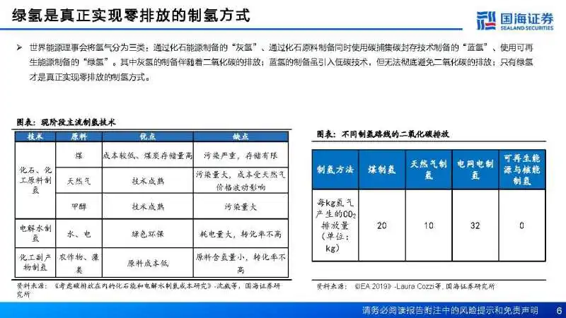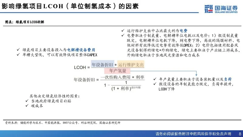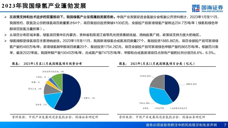绿醇绿氨崛起,投资机会涌现发表时间:2024-05-07 15:09 绿氢项目涌现,经济逐渐可行绿氢是真正实现零排放的制氢方式 世界能源理事会将氢气分为三类:通过化石能源制备的“灰氢”、通过化石原料制备同时使用碳捕集碳封存技术制备的“蓝氢”、使用可再生能源制备的“绿氢”。其中灰氢的制备伴随着二氧化碳的排放;蓝氢的制备虽引入低碳技术,但无法彻底避免二氧化碳的排放;只有绿氢才是真正实现零排放的制氢方式。 2023年我国绿氢产业蓬勃发展 在政策支持和技术进步的双重推动下,我国绿氢产业呈现蓬勃发展态势。中国产业发展促进会氢能分会根据公开资料统计,2023年1月至11月,我国签约、获批及公示的绿氢项目数量累计64个,项目规划总投资突破4100亿元,全部投产后新增绿氢产能将达234.7万吨/年(绿氨和绿色甲醇项目按氢当量折算)。 从项目分布区域来看,绿氢项目集中在内蒙古、吉林省和黑龙江省等风光资源禀赋优越、消纳前景广阔、政策端支持力度大的地区。绿氨绿醇是绿氢项目主要消纳途径。2023年1月至11月,我国新增绿氢合成氨项目数量27个,规划投资1885.8亿元,项目全部投产后可新增绿氨产能约485万吨/年;新增绿氢制甲醇项目数量20个,规划投资1754.2亿元,项目全部投产后可新增绿色甲醇产能约865万吨/年。根据百川盈孚,截至2022年底,我国甲醇产能10045万吨/年,合成氨产能7475万吨/年,甲醇和合成氨新增项目占原有产能的比例分别为8.6%、6.5%。 电解槽价格、电耗是影响LCOE的主要因素 据我们测算,目前风电、光伏度电成本分别为0.222元/千瓦时、0.175元/千瓦时,根据风光耦合制氢项目环评,并考虑到风光资源的波动性,出于谨慎性原则,我们计算出综合电价为0.221元/千瓦时。 PEM电解槽:较碱性电解槽制氢成本更高 PEM电解槽制氢成本主要由电力成本、设备折旧等构成。根据我们测算,截至2024年1月,当光伏及风电耦合电价在0.22元/kWh、200Nm3/h的PEM电解槽设备价格在750万元,年度运行时间3833h时,PEM电解槽制氢成本为18.64元/kg,电耗占制氢成本比重约66%。 煤制氢气:煤炭占制氢成本比重约70% 煤制氢成本主要由燃煤成本、设备折旧等构成,其中,燃煤成本是主要来源。根据我们测算,截至2024年1月,当5500大卡煤价在845元/吨时,煤制氢成本为9.09元/kg,煤炭成本6.34元/kg,占制氢成本比重约70%。 光伏电站的平准发电成本为0.175元/kWh 截至2024年1月,根据光伏电站投资成本等数据,假设光伏电站运行周期为25年,年发电小时数为1500小时,按照5%的折现率,计算得出光伏电站的平准发电成本为0.175元/kWh。 组件价格仍处于下降通道 据索比光伏网公众号,2023年,P型组件最低报价为0.83元/W、N型组件最低报价为0.862元/W( 均不含运费)。根据2024年1月9日,中国电建集团(股份)公司2024年度光伏组件框架入围集中采购招标开标结果来看,P型组件最低报价为0.806元/W,N型组件最低报价为0.87元/W(含运费价格),据隆基股份,组件国内运费平均稳定在3分钱/W,因此当前价格刷新2023年以来最低价格记录,组件价格持续下行。 风光发电在总电量中的占比提升 目前我国绿氢制取,尚难做到完全离网制氢,需要部分网电参与。调整制氢负荷与风光出力同频波动,利用谷电资源降低综合电价。目前,大型风光耦合制氢项目经过计算优化将制氢负荷与风光出力保持同频波动。当风光出力不足时,通过购电保持制氢负荷在较低负荷运行,由于网电低谷时段电价较低,生产氢气更有利于增加项目收益,同时也更有利于系统的稳定操作。 政策端释放信号,区域发展因地制宜 国家层面,2023年8月8日,国家标准委、国家发改委等6部门联合发布《氢能产业标准体系建设指南(2023版)》,这是国家层面首个氢能全产业链标准体系建设指南。《氢能产业发展中长期规划(2021-2035年)》提出了绿氢发展的3个阶段性目标,其中,明确提出到2025年实现可再生能源制氢量每年达到10~20万吨。 省级层面,各省市出台相关政策对2025年绿氢产能做出规划。内蒙古、河北、吉林、宁夏、甘肃等省份发布的氢能专项规划数据显示,2025年末国内可再生能源制氢量至少可达98万吨/年,对于绿氢产业整体发展呈现利好态势。根据GGII统计,目前已建成和开建绿氢项目产能已超过74万吨,规划产能超过200万吨。 国内绿氢项目最新趋势有哪些? 通过梳理目前规划及在建的绿氢项目,我们发现如下趋势: 1)大化工领域是绿氢主要应用场景,终端能源消费渗透率逐步提升。据中国石化《中国能源展望2060》,2023年,我国氢气消费量约3549万吨,在终端能源消费总量中的占比不足4%。几乎全部氢气用于工业部门,建筑、交通等部门用氢合计不足3%。预计未来氢能将扮演燃料、原料、储能介质等多重角色,广泛深度参与工业、交通、建筑、风电等部门的碳中和进程。2023年11月,继河北、广东之后,吉林成为第三个明确制氢加氢站不需进入化工园区的省份,氢能危化品属性正在逐步弱化,能源属性持续加强。 2)风光氢储一体化产业热度高,氢储能成为新业态。风光氢储一体化项目投资规模大,绿氢“制储输用”全产业链发展有助于解决风光资源的消纳,同时有利于发展地区氢能产业建设。 3) 电解槽方面,ALK是当前主流,“碱性(ALK)+PEM”协同制氢未来可期。ALK技术成熟,成本较低,落地项目较多,但对电力波动的适应性较差;PEM技术响应速度更快,可调节范围更广,可适应波动电源输入,可价格