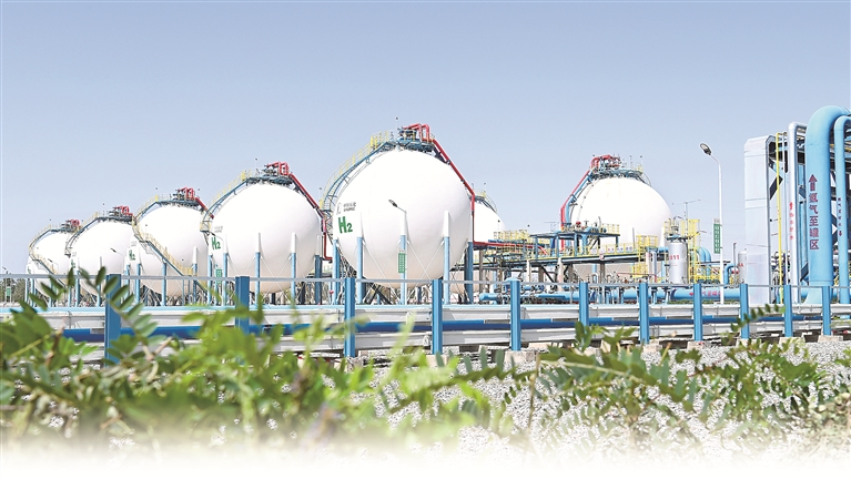 新疆维吾尔自治区阿克苏地区,中国石化新星绿氢公司制氢厂内,一个个储氢罐装置整齐排列。 图片来源:视觉中国