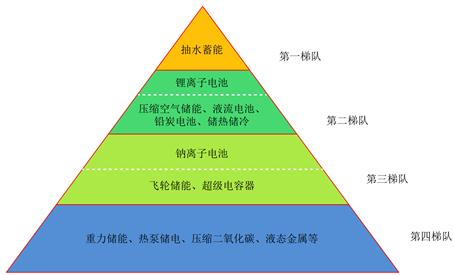图1 2022年中国储能技术和世界先进水平的比较成熟度 资料来源:陈海生等《2022年中国储能技术研究进展》。 综合分析我国各储能技2022年的基础研究、关键技术和集成示范的情况,各种储能技术可以大致分为四个梯队。其中,第一梯队为抽水蓄能,单机规模100MW以上,占2022年全国储能装机的77.1%左右;第二梯队为锂离子电池、压缩空气储能、液流电池、铅蓄电池和储热储冷技术,单机规模可达10-100MW,其中锂离子电池装机最多,有可能未来形成单独的一个梯队;第三梯队为钠离子电池、飞轮储能和超级电容器,目前单机规模可以达到MW级,其中钠离子发展受关注最多,有可能未来进入第二梯队;第四梯队为重力储能、热泵储电、压缩二氧化碳和液态金属技术等新型储能技术,需要进一步的研发,以便实现集成示范和产业化应用。
