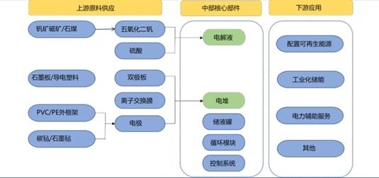 图7 全钒液流电池的构成 资料来源:北京低碳院,安信证券。 ——优缺点。全钒液流电池的优点包括:1)相较于锂离子电池,安全性更高。全钒液流电池的电解液为钒离子的酸性水溶液,在常温常压下运行,不存在热失控、着火爆炸的风险,具有本征安全性。在空间占用方面,锂离子电池储能系统需要满足更为严格的消防及安全标准,在集装箱的排布上必须留出更大的安全距离,而全钒液流电池无此问题,因此布局更为紧凑,占地更加集约。2)循环寿命长。循环次数可达16000次以上,显著优于锂离子电池,且生命周期内容量可完全恢复,容量衰减问题小(相比之下,锂离子电池的可用容量会随着循环次数的增加而明显下降)。3)充、放电性能好。可深度放电而不损坏电池。自放电低,在系统处于关闭模式时,储罐中的电解液无自放电现象。4)启动速度快,无相变化,充放电状态切换响应迅速。5)输出功率和储能容量相互独立,便于模块化集成和规模放大。全钒液流电池实现了电芯功率和容量的分离,输出功率和储能容量可独立设计。要增加输出功率,仅需增加电堆的数量;要增加储能容量,仅需增加电解液的体积(储液罐的容量)。设计和安装灵活,便于模块化设计和规模放大,因此适用于大规模、大容量、长时储能, 其储能时长越长,单度电分摊成本将大幅度降低,价格越便宜。近期的项目设计规模已达到200MW,远超锂电池储能系统规模。6)我国钒资源储量丰富,供应链安全性更强。我国已探明钒矿储量占全球43%(美国地质勘探局USGS数据),产量约占全球三分之二,相比于锂电池在核心矿产方面对外依赖度高,发展钒电池可避免受制于人。 全钒液流电池的缺点包括:1)能量密度不高。全钒液流电池的能量密度为12-40Wh/kg,低于锂电池的80-300Wh/kg。不过,固定式储能系统对能量密度要求不高,因此液流电池更适用于大规模蓄电储能。2)初始投资成本较高。目前锂电池储能电站的初始投资成本最低可达到1.6元/Wh,而钒电池储能项目初始投资成本普遍在3元/Wh以上。近期钒电池成本下降较快,2022年11月中核汇能1GWh液流电池储能采购中标候选人公示中,最低中标单价达到2.2元/Wh。虽然钒电池初装成本较锂电池偏高,但全寿命周期使用成本与锂电相近,在长时储能场景更具优势。不过仍要考虑如果钒资源开发力度不如预期,钒电池大规模应用拉动钒价上涨、拉高电解液成本,则可能削弱全钒液电池的全寿命周期的性价比优势。 全钒液电池储能产业链 全钒液流电池主要由电解液、交换膜、电极、双极板等组成。电解液是钒离子的储存介质,占系统成本的35%-40%(其中五氧化二钒占电解液成本60%左右),其性能将直接影响到电池系统的工作效率、运行工况和使用寿命等;交换膜是电池内用于钒离子交换的膜材料;电极是氧化还原反应的主要发生场所,包括一个正极和一个负极;双极板是用来电气连接但液压分离相邻电芯的一种隔板,主要功能为隔离正负极电解液、汇集电流和支撑电极等。双极板、离子交换膜、电极、电极框架等构成电堆,电堆是钒电池系统的重要部件,是发生电化学反应的主要场所,可占总成本的35%,而电堆成本中55%来自于离子交换膜。其他装置(如管路与控制系统、循环泵等)占总成本的30%。全钒液流电池产业链如下图所示。