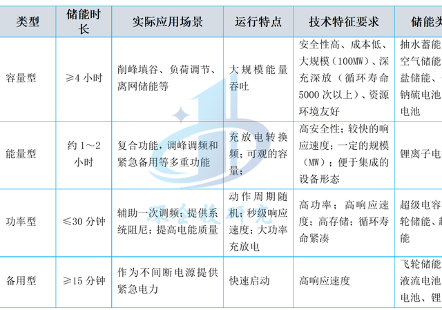 资料来源:深企投产业研究院整理。功率按照现实项目(包括规划项目)的最大功率,非理论值。 按照时长要求的不同,储能的应用场景可分为容量型(≥4小时)、能量型(约1~2小时)、功率型(≤30分钟)和备用型(≥15分钟)四类,对应的应用场景如下表所示。 表2 储能技术应用场景