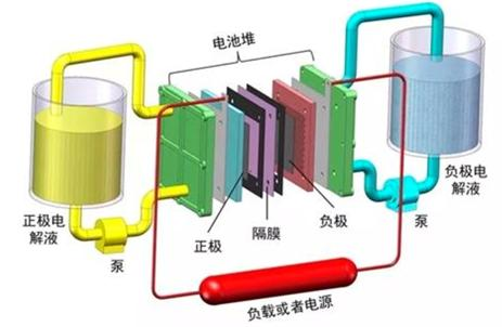 资料来源:深企投产业研究院整理。 04 钒液流电池 ——应用现状。我国液流电池储能的研发推广处于世界领先水平。根据CNESA数据,截止2022年底液流电池占我国已投运新型储能累计装机规模的1.2%。液流电池根据活性材料分类,可分为全钒液流电池,锌基液流电池(锌溴、锌铁、锌镍、锌空气等),铁铬液流电池、全铁液流电池等等。其中全钒液流电池是目前最接近产业化和规模化应用的一种电池,而其他液流电池技术成熟度稍低,仍然面临活性物质的沉积、电解液互窜、功率密度低、容量和能量无法完全解耦、析氢和析氧等问题,基本上处于工程化示范阶段。在应用场合方面,液流电池有望与锂离子电池形成差异化竞争,主要在4小时及以上,百兆瓦时以上的容量储能场合进行推广。 全钒液流电池随着大规模产业化加速,渗透率将不断提升,装机规模呈增长趋势。根据EV Tank发布的数据,2021年中国钒电池新增装机量0.13GW,2022年国内大量的钒电池储能项目开工建设,预计全年新增装机量将达到0.6GW。据EV Tank预测,预计2025年钒电池新增规模将达到2.3GW,2030新增量将达到4.5GW,届时钒电池储能项目累计装机量将达到24GW,当年新增市场规模将达到405亿元。GGII预测,2025年国内液流电池出货量有望超过10GWh(按4小时测算,含出口),复合增速高达95.5%。 ——工作原理。液流电池通过离子选择膜的离子交换将化学能转化为电能,离子选择膜将两种液体电解质分开存储在不同的罐中,利用两种化学溶液进行离子交换来进行充放电,其电压一般在1.0-2.2V之间。与其它电池相似,液流电池的功率与隔膜面积成正比,而储存能量的多寡和溶液储存容量成正比。 液流电池正负极全使用钒盐溶液的称为全钒液流电池(全钒氧化还原液流电池),简称钒电池。钒电池电能以化学能的方式存储在不同价态钒离子的硫酸电解液中,通过外接泵把电解液压入电池堆体内,在机械动力作用下,使其在不同的储液罐和半电池的闭合回路中循环流动,采用质子交换膜作为电池组的隔膜,电解质溶液平行流过电极表面发生电化学反应,通过双电极板收集和传导电流,从而使得储存在溶液中的化学能转换成电能。这个可逆的反应过程使钒电池顺利完成充电、放电和再充电。
