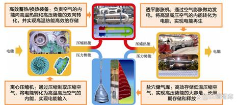 图3 传统压缩空气储能技术原理 资料来源:中国科学院工程热物理研究所《浅谈“压缩空气储能技术”》。 ——优缺点。压缩空气储能具有启动快速、能量密度和功率密度较高、运营成本低、设备使用寿命长、损耗低等优点,一般可储释能上万次,寿命达40-50年。缺点是,能量转换效率低下(仅能到50%),需要大洞穴或者大容量储气装置存储压缩空气、存在地域(地质)条件限制,投资回报期较长。压缩空气储能中,储气方式不同,成本差异较大,单位成本约7000-9000元/kW,总体上当前压缩空气储能的单位成本高于抽水蓄能和电化学储能,单位kWh成本则与电化学储能相当。目前压缩空气储能度电成本0.24-0.25元,随着规模提升,新型压缩空气储能系统的度电成本可达到0.2元,如果未来能降到0.15元以下,则经济效益更加显著。 压缩空气储能产业链 上游为装备制造、储气库。压缩空气储能系统主要由压缩机、空气透平膨胀机(空汽轮机)、发电机、换热器、储热介质等构成,储能电站设备投资约占65%-70%,其余为土建安装及其他辅助工作。其中核心设备为压缩机(离心式空气压缩机),可占到储能电站投资的15%以上;换热器、透平机、辅助系统、控制系统等,和传统火电站配置类似,约占储能电站投资的15%,基本无技术瓶颈。