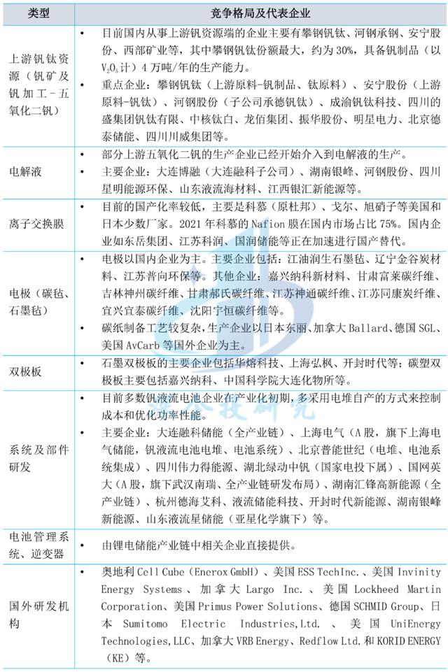图8 全钒液流电池产业链 资料来源:长城证券。 当前国内全钒液流电池市场总体体量较小,龙头格局未显,产业仍处于发展初期。产业链各环节的竞争格局和代表企业如下表所示。 表4 全钒液流电池产业链代表企业