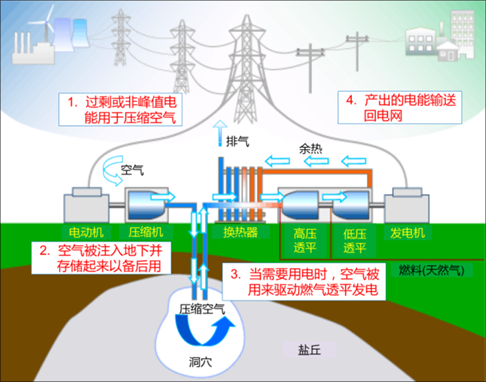 图2 2022年中国储能集成示范和产业化梯队 资料来源:陈海生等《2022年中国储能技术研究进展》。 02 压缩空气储能 ——应用现状。压缩空气储能(CAES)目前处于小规模应用阶段。据CNESA(中国能源研究会储能专委会/中关村储能产业技术联盟)统计,截至2021年底,压缩空气储能在全球新型储能装机规模中的占比为2.3%。根据国家能源局数据,截止2022年底,压缩空气储能占全国新型储能装机规模的2%(如按照CNESA全球储能数据库的不完全统计,占比为1.5%)。当前压缩空气储能整体产业规模仍较小。 ——工作原理。传统的压缩空气储能是基于燃气轮机开发的储能技术,其工作原理是,在用电低谷,用过剩的电能来驱动压缩机,将空气压缩至高压并储存在储气装置(如地面储气罐、地下盐穴、地下人工硐室等)中,使电能转化为空气的内能存储起来;在用电高峰,由储气装置释放储存的高压空气,通过(进入燃烧室)燃烧或者换热的方式,加热压缩气体,将其输送至膨胀机内膨胀做功,推动发电机发电。其工作原理如下图所示。