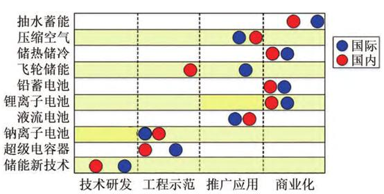 资料来源:中国能建《关于“熔盐储热”技术》,天风证券等,深企投产业研究院整理。 从各类储能技术的研发推广进程看,目前我国储能技术基本上与国际先进水平并跑,压缩空气储能、储热储冷、铅蓄电池、锂离子电池、液流电池和钠离子电池技术已达到或接近世界先进水平;抽水蓄能、飞轮储能、超级电容和储能新技术与世界先进水平还有一定的差距,如下图所示。