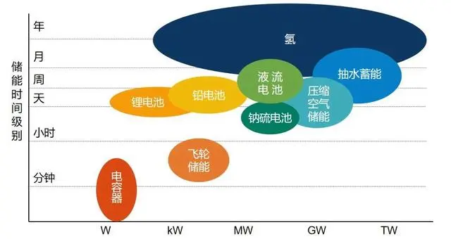 燃气机“一拖一”联合循环发电机组发电原理图 目前我国天然气发电装机约1.1亿千瓦,预计“十四五”末将达到1.5亿千瓦,装机规模快速提升。国内燃气轮机整体水平暂与国际先进水平差距较大,尚未形成严格意义上的燃气轮机产业。2003年至2013年,通过三次打捆招标以及后续招标,东方、哈尔滨、上海等动力设备制造企业分别引进三菱、GE、西门子公司的F/E级重型燃机部分制造技术,进行本地化制造,经过国产化四个阶段和合资热部件企业,具备了重型燃机的整机生产能力。 重型燃气轮机的燃料掺混氢气比例可达30%~50%,工业燃气轮机的燃料掺混氢气比例可达50%~70%。对于F级重型燃气轮机燃烧器,氢含量在20%以内时,燃机燃烧器运行稳定,NOx排放可以控制在30毫克/立方米内。燃机效率≥60%,绿电-绿氢-燃机发电效率约42%。 解决跨季节长时储能问题新能源逐步成为能源供应的主体后,构建新型电力系统面临的关键问题是如何实现电力的可靠供应。新能源发电具有随机性、波动性、季节不均衡性等特性,这给电力系统的稳定运行带来了挑战。为了应对这一挑战,我们需要发展不同功能定位的储能技术,以实现不同时间尺度上的功率与能量平衡。 储能技术按时间尺度可分为超短时(秒级到分钟级)、短时(小时级到数小时级)储能和长期(日、周、月、年)储能。目前,我们已经开发出了多种类型的储能技术,如电容器、飞轮储能、电化学储能(锂电池、铅电池、钠硫电池、液流电池)、压缩空气储能、抽水蓄能、氢储能等。这些技术各有优缺点,可根据不同的应用场景选择合适的储能技术。