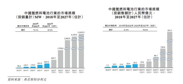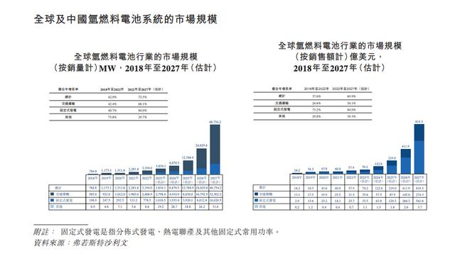 行业层面,2022年全球氢燃料电池行业的市场规模已达到58亿美元,自2018年起以37.6%的复合年增长率增长。预计全球氢燃料电池行业的市场规模将于2027年达到820亿美元。 同期,全球氢燃料电池销量由2018年的784.8MW增至2022年的3194.0MW,以42.0%的复合年增长率增长。燃料电池汽车则是主要驱动因素,预计到2027年全球氢燃料电池市场将达到48754.2MW,期间复合年增长率预计为72.5%。