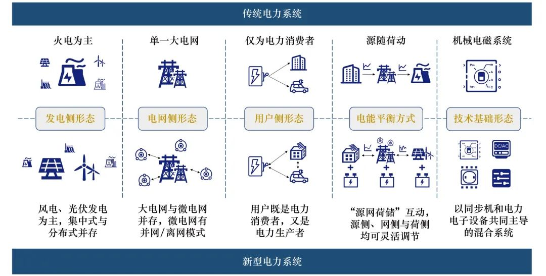 1. 物理储氢技术 (1)高压气态储存技术。高压气态储氢是指在高压下,将氢气压缩,以高密度气态形式储存于特定容器中,是目前应用最广泛的储氢方式。相对其他储氢技术,其具有成本较低、能耗低、易脱氢、工作条件较宽松等特点,是目前最常用并且发展最成熟的储氢技术,其难点主要集中在储氢容器的研制上。目前,储氢容器通常为耐高压的钢制气瓶,主要包括金属储罐、金属内衬纤维缠绕储罐和全复合轻质纤维缠绕储罐。 (2)低温液态储存技术。低温液态储氢将氢气冷却至-253 ℃,液化储存于低温绝热液氢罐中,储氢密度可达约71 kg/m3,体积密度为气态时的845倍,实现高效储氢,其输送效率高于气态氢。但液氢装置一次性投资较大,液化过程中能耗较高,储存过程中有一定的蒸发损失,其蒸发率与储氢罐容积有关,大储罐的蒸发率远低于小储罐。国内液态储氢应用成本较高,目前主要用于航天航空领域及军事领域。北京航天试验技术研究所(101所)以及北京中科富海低温科技有限公司等正在突破相关核心装备。 (3)地质储氢技术。氢气地质储存是氢能大规模和长期储存的最佳选择。国际上,根据现有的地理条件,选择盐穴、废弃矿井、油气井和含水层大规模长期储存压缩氢气的方式。这种储氢成本低,约0.6美元/kg,效率约为98%。从具体国家来看,美国具有最大的可储存氢的盐穴(1×104~2×104 t),英国有3个盐穴可以储存1000 t氢气,德国计划于2023年建设1个氢气的盐穴储存示范项目(3500 t)。 2. 化学储氢技术 与物理储氢不同,化学储氢方案一般通过利用储存介质与氢气结合为稳定化合物的方式实现氢储存。用氢时,通过加热或其他方式使化合物分解放氢,同时回收储存介质。根据储存介质种类不同,化学储氢技术主要包括金属氢化物储氢、液态有机氢载体储氢、无机物储氢、液氨储氢等。与高压气态储氢和低温液态储氢相比,化学储氢技术成熟度相对较低,目前多在实验室、示范项目环节。 (1)固态储存技术。固态储氢是利用氢气和储氢材料之间发生物理或化学反应从而转化为固溶体或者氢化物的形式进行氢气储存。固态储氢材料主要可分为物理吸附储氢和化学氢化物储氢。相较于高压气态和低温液态储氢,其储氢体积密度较大、储氢压力小、运输方便、安全性高、可重复利用等优点,适用于对体积要求较严格的应用场景,是最具发展潜力的一种储氢方式。但其对储氢材料要求较高,目前,各种材料多数处于研究阶段。 (2)有机液态储氢。有机液态储氢是通过不饱和液体有机物的可逆加氢和脱氢反应来实现氢能储存的方法。该技术先将液体有机氢能载体催化加氢储能,再将加氢后的液体输送至各站点分发,最后输入脱氢反应装置中发生催化脱氢反应,释放氢能。有机液态储氢具有较高储氢密度,在环境条件下即可储氢,安全方便,可实现跨季节、跨地区的长期储存,便于长距离运输,但也存在费用高,氢气纯度不够等缺点。 (3)液氨储氢技术。氢与氮气在催化剂作用下合成液氨,以液氨形式储运。液氨在常压、约400 ℃下分解放氢。相比于低温液态储氢技术要求的极低氢液化温度(-253 ℃),氨在一个大气压下的液化温度要高得多(-33 ℃),“氢 ‒ 氨 ‒ 氢”方式的耗能、实现难度及运输难度相对更低。同时,液氨储氢中体积储氢密度比液氢高1.7倍,更远高于长管拖车式气态储氢技术。该技术在长距离氢能储运中有一定优势。 三、氢储能在新型电力系统中的应用价值及规模分析 相比于传统电力系统,新型电力系统有以下几点重要变化,如图2所示。 ① 从发电侧形态上看,将从以火电为主转向以风、光等新能源发电为主。特征变化方面,从高碳电力系统变为低碳电力系统、从连续可控电源变为随机波动电源。 ② 从电网侧形态上看,将从单一大电网演变为大电网与微电网互补并存。特征变化方面,从刚性电网变为灵活韧性电网、电网数字化水平从低到高。 ③ 从用户侧形态来看,将从电力消费者转变为电力“产消者”。特征变化方面,从静态负荷资源转变为动态可调负荷资源、从单向电能供给变为双向电能互济、终端电能替代比例从低到高。 ④ 从电能平衡方式上看,将由“源随荷动”转变为“源网荷储”互动。特征变化方面,从自上而下调度模式变为全网协同的调度模式、从实时平衡模式变为非完全实时平衡模式。 ⑤ 从技术基础形态上看,将从以同步机为主的机械电磁系统变为以同步机和电力电子设备共同主导的混合系统。特征变化方面,从高转动惯量系统变为弱转动惯量系统。