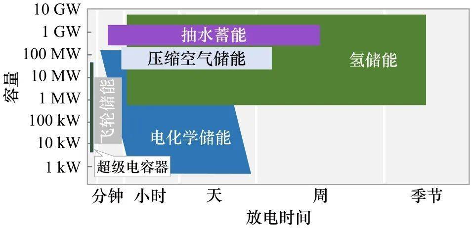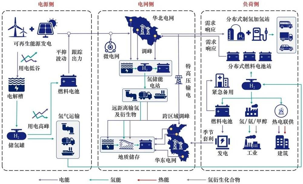 图2 新型电力系统与传统电力系统的对比 针对上述变化,新型电力系统面临着诸多新诉求: ① 构建新型电力系统的核心是新能源成为主体电源后如何实现不同时间尺度上的功率与能量平衡,其关键在于统筹发展不同功能定位的储能。电化学储能主要解决系统短期尺度的功率平衡,难以应对周、月、季等长期尺度下的能量不平衡问题,亟需引入先进的长时储能技术。 ② 随着新能源逐步取代化石能源装机,能量在空间上的不平衡性愈发凸显。现阶段调峰资源以火电机组、抽水蓄能电站为主,跨区域调峰能力受输配电网络布局和容量的限制,且随着煤电机组的提前退役和抽水蓄能电站开发殆尽,未来调节能力有限,亟需引入大规模、跨区域的新兴调峰手段。 ③ 电能替代是实现碳中和目标的重要手段。然而,单纯依靠电气化难以实现重卡运输、铁路货运、航空航天等交通领域和冶金、水泥、化工等工业领域的深度脱碳,新型电力系统亟需与其他深度脱碳的能源品种进行有机融合。 面对以上新型电力系统的诉求,氢能可发挥如下的关键作用: ① 氢可以多种方式进行储存,如高压压缩、低温液化、固体储氢、转化为液体燃料或与天然气混合储存在天然气基础设施中,从而实现小时至季节的长时间、跨季节储存; ② 液态氢能量密度大(143 MJ/kg,可折算为40 kWh·kg),约为汽油、柴油、天然气的2.7倍、电化学储能(根据种类不同,在100~240 Wh/kg)的百倍,氢储能是少有的能够储存百吉瓦时以上的方式,且氢气的运输方式多元,不受输配电网络的限制,从而实现大规模、跨区域调峰; ③ 氢能作为高能量密度、高燃烧热值的燃料,可在重卡运输、铁路货运、航运和航天等交通应用场景发挥重要作用;与此同时,氢能还是一种重要的工业原料,绿色氢能可用于替代化石燃料作为冶金、水泥和化工等工业领域的还原剂。 氢储能在新型电力系统中的定位有别于电化学储能,主要是长周期、跨季节、大规模和跨空间储存的作用,在新型电力系统“源网荷”中具有丰富的应用场景,如图3所示。