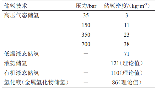 目前,国内也有少量氢储能项目已正式运行或试运行。安徽六安兆瓦级制氢综合利用示范工程是国内首座兆瓦级氢储能电站,利用1 MW质子交换膜电解制氢和余热利用技术,实现电解制氢、储氢、售氢、氢能发电等功能。 宁夏宝丰一体化太阳能电解水制氢储能及综合应用示范项目为全球单厂规模最大、单台产能最大的电解水制氢项目,采用新能源发电 ‒ 电解水制绿氢 ‒ 绿氧直供煤化工的模式,包括2×105 kW光伏发电装置和产能为每小时2×104 m3的电解水制氢装置,项目投产后每年可减少二氧化碳排放约4.45×105 t。大陈岛氢能综合利用示范工程是全国首个海岛“绿氢”综合能源示范项目,通过构建基于100%新能源发电的制氢 ‒ 储氢 ‒ 燃料电池热电联供系统,实现清洁能源百分百消纳与全过程零碳供能。 (二)氢储能技术 与其他燃料相比,氢的质量能量密度大,但体积能量密度低(汽油的1/3000),因此构建氢储能系统的重要前提条件之一是在较高体积能量密度下储存氢气。目前,主要储氢方式可以分为物理储氢和化学储氢。物理储氢包括高压气态储存技术、低温液态储存技术和地质储氢技术;化学储氢包括固态储存技术、有机液态储氢技术和液氨储氢技术。不同储氢技术的密度如表2所示。 表2 不同储氢技术的密度