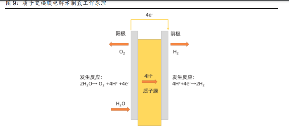 水电解制氢四种技术基本原理相同,但在电解槽材料和电解反应条件上存在差异。四者都在氧化还原反应过程中,阻止电子的自由交换,将电荷转移过程分解为外电路的电子传递 和内电路的离子传递,从而实现氢气的产生和利用,技术成熟度、运行温度、电流密度等材料及反应条件各异。 1)碱性电解水制氢 碱性电解水制氢是指在碱性电解液环境下进行电解水制氢的过程,电解液一般为KOH或NaOH水溶液。将电解质溶液置于电解槽内,通过隔膜将槽体分解为阴、阳两室,各电极置于其中,电流在一定电压下通过电极将水分解,在阳极产生氧气,在阴极产生氢气,以此达到制氢目的。 碱性电解水制氢系统主要包括碱性电解槽主体和 BOP 辅助系统。碱性电解槽由电极、电解液、隔膜及极板、垫片等零部件组成,其中隔膜通常为石棉或者为高分子复合材料,电极一般采用镍基金属材料,极板通常采用铸铁金属板、镍板或不锈钢金属板。碱性电解槽工作温度一般为 70-90℃,产生的氢气纯度在99%以上,经分离后的氢气需要脱除其中的水分和碱液。一般电解槽需要降低电压增大电流以提高转化效率,成本与其制氢能力有关,制氢能力越大,成本越高。碱性电解水制氢装置 BOP 辅助系统包括八大系统:电源供应系统、控制系统、气液分离系统、纯化系统、碱液系统、补水系统、冷却干燥系统及附属系统。 碱性电解水制氢是目前发展最为成熟的制氢技术,具备槽体结构简单、安全可靠、运行寿命长、操作简便、售价低廉等优点,是市场上主要的电解制氢方式,广泛应用于冶金、医药、储能、食品等行业。 2)质子交换膜电解水制氢(PEM) 质子交换膜电解水制氢技术简称PEM(Proton exchange membrane),和碱性电解水制氢的区别是,PEM电解制氢使用质子交换膜作为固体电解质替代碱性电解槽使用的隔膜和碱性电解液,避免了潜在的碱液污染和腐蚀问题,安全性更高。质子交换膜电解水制氢同样是是纯水发生电化学反应分解产生氧气和氢气的过程。电解水的能源则利用太阳能、风能和水力发电等零碳能源,制氢过程无污染排放,是最清洁环保的“绿氢”。