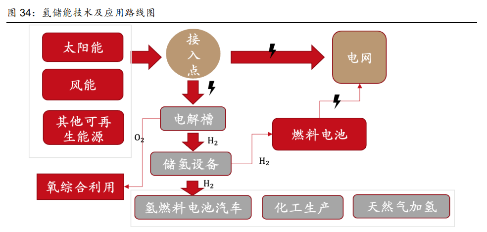 4)工业副产氢成本测算——单位成本约 9-22 元/kg 工业副产氢成本主要包括生产成本和提纯成本,各类副产氢综合成本介于 9-22 元/kg 之间。焦炉煤气制氢在工业副产氢中具备成本优势,单位制氢成本约 9-15 元/kg,由于其显著的减排效果和较高的经济性优势,在电解水绿氢成本达到或接近平价以前,副产氢是过渡阶段的较优途径。 5)电解水制氢——成本约 21 元/千克,电价降至 0.15 元/度时与灰氢平价 电解水制氢的主要影响因素为电价成本,年运行小时数及电耗。目前主流的电解水制氢路径是碱性电解水(ALK)以及质子交换膜纯水电解制氢(PEM)两种技术路径。我们对比 ALK 与 PEM 两种技术路径下的制氢成本: ①ALK:在假设年运行小时数为 5000h,电价为 0.3 元/度,电耗为 5Kwh/Nm³ 时,电解水制氢成本为 21.07 元/kg,其中电费成本为 16.80 元/kg,占比达 80%。 ②PEM:在假设年运行小时数为 8000h,电价为0.3 元/度,电耗为4.8Kwh/Nm³时,电解水制氢成本为 21.34 元/kg,其中电费成本为 16.13 元/kg,占比达 76%。 2.2 中游:氢能储运 主流高压气态储氢安全隐患大,固态储氢或成为未来技术热点。从技术路线上看,氢能储运主要有四种形式:高压气态储氢、低温液态储氢、固态储氢和有机液体储氢。目前最常用的是高压气态储氢,即利用高压将氢气压缩到高压容器中,其技术成熟度最高,氢气压缩能耗低,另外氢气储存多采用钢瓶,结构简单、充放气速度快,但存在较大的安全隐患;低温液态储供模式下,液氢体积能量密度大,因此储运简单安全、运输成本低,但把氢气液化耗能较大,液化1kg的氢气需要耗电4-10千瓦时,且液氢的存储容器需要具有抗冻、抗压以及严格绝热的特性,因此综合成本较高,目前主要用于航天航空领域。固态储氢是利用储氢材料与氢气反应生成稳定化合物,相比于高压气态和低温液态两种储氢方式,具有操作容易、运输方便、成本低、安全性高等明显优势,长期来看发展潜力最大。有机液体储氢是通过不饱和液体有机物的可逆加氢和脱氢反应来实现储氢,目前仍有较多的技术难题尚未攻克,导致费用较高、氢气纯度不够,但是有机液体储氢能够在常温下运输,安全性较高,并且可以利用现有加油站设施进行加注,在未来极具应用前景。 2.3 下游需求:化工需求为主,工业及交通领域需求潜力巨大 全球能源结构转型加快,氢能成为重点关注对象。受全球气候变暖、保障能源安全、保护生态环境等方面因素的影响,全球能源结构持续向低碳化转型。随着《巴黎气候协定》的签署,二氧化碳减排计划的实施更为紧迫。氢能以其清洁无污染、来源广、可再生、可储存等优势,成为化石能源的重要替代品,是许多国家能源转型的战略选择,全球已有超过20个国家或联盟发布或制定了《国家氢能战略》。据国际氢能委员会预测,2050年全球能源消费结构中,氢能占比有望达 18%,同时还将创造 3000 万个工作岗位,减少 60 亿吨 二氧化碳排放量,产值达 2.5 亿美元。