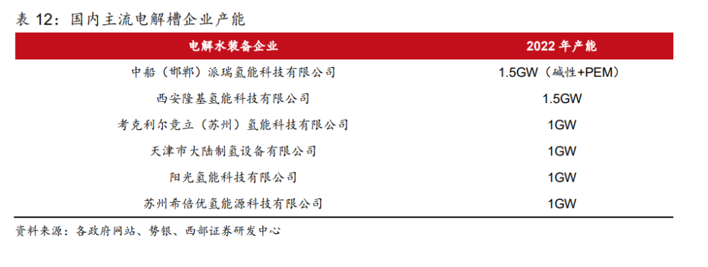 4.1.2 阳光电源 前瞻性布局氢能。公司于2019年布局氢能业务,成立了专门的氢能事业部。公司在稳步发展新能源装备业务时,也在氢能领域不断加大研发投入。2021年3月,公司以推出的国内首款可量产功率最大(250kW)和电流密度最高(1.5A/cm2)的 SEP50 PEM 制氢电解槽为标志,正式踏入制氢设备领域。并于2021年6月,公司成立全资子公司——阳光氢能科技公司。公司拥有碱水电解制氢系统技术(ALK)和质子交换膜(PEM)纯水电解制氢技术两种技术路线,以及配套的 MW 级专用制氢整流电源、智慧氢能管理系统。 氢能与储能相互协同。公司联手中国科学院大连化学物理研究所成立 PEM 电解制氢技术联合实验室,以大功率 PEM 电解制氢装备的研究开发为核心,加强可再生能源和电解制氢的融合,改善优化制氢系统。利用光伏、风电等可再生能源供电的水电解生产的氢气(绿氢), 再通过燃料电池等方式转换为电力,可实现氢储能的“电-氢-电”循环。公司在多地开展了光伏制氢项目,业务扩张迅速。随着可再生能源渗透率提升和电解制氢成本降低,氢能源有望迎来快速发展。未来若氢能实现大规模应用,氢能业务将助力于公司的长期发展。 4.1.3 华电重工 氢能产业布局稳步开展。2020年华电重工正式成立氢能事业部,以可再生能源高效利用、 二氧化碳减排利用、工业尾气综合利用为方向,致力于为客户提供制售氢、装备制造、工程总包等一体化服务。2020年氢能业务承接甘电投氢能利用研究课题,签订2个气体扩 散层供货合同。公司承担华电集团“揭榜挂帅”项目和国家重点科技攻关项目,在泸定电解水制氢装置试运行成功,氢气纯度大于 99.99%,推动包头达茂旗、青海德令哈两个项目落地,同时对多个项目进行跟踪,业务涉及制氨、氢燃料电池汽车、玻璃等多个用氢场景,为公司后续业务开展打下基础。 2022年氢能业务突破巨大。2022年5月公司并购深圳通用氢能51%的股权,公司更加看重通用氢能的专家团队,能够为公司在氢产业上的发展提供技术上的支持,目前已在气 体扩散层、质子交换膜方面取得重大突破;2022年7月,公司1200Nm3/h碱性电解水制氢装置与气体扩散层产品已成功下线;2022年11月,与内蒙古华电氢能科技有限公司签署了《内蒙古华电包头市达茂旗20万千瓦新能源制氢工程示范项目PC总承包合同制氢站部分》,合同金额为3.45亿元人民币,计划2023年内投产。 4.1.4 华光环能 与大连理工紧密合作,制氢项目逐一落地。公司业务横跨环保、能源两大领域,涉及装备制造、工程与服务以及项目运营等。背靠无锡国资,公司并入国联环保、市政设计院、国联环科、无锡蓝天、中设国联等多项优质资产。公司作为无锡市氢能联盟理事长单位,与政府相关部门沟通,积极布局无锡氢能产业。2022年公司与大连理工大学合作成立零碳工程技术研究中心,进行电解水制氢、碳捕捉技术等示范项目的开发。公司凭借装备制造方面多年的经验,成功实现了碱性水电解槽制氢技术、装备及系统集成的成功落地历时70天完成了30m³/h制氢设备及系统的研发和生产,设备在程度中试顺利。公司研制的制氢设备,对主副电极结构进行了改进,采用新型环保隔膜材料,大幅提高了电流密度,同等产氢量下,设备体积大幅减小。在此基础上,公司近期计划试制线下大型可商业化应用水电解槽制氢设备,从氢能设备制造到储运装备、投资运营,逐步向下游延伸布局。