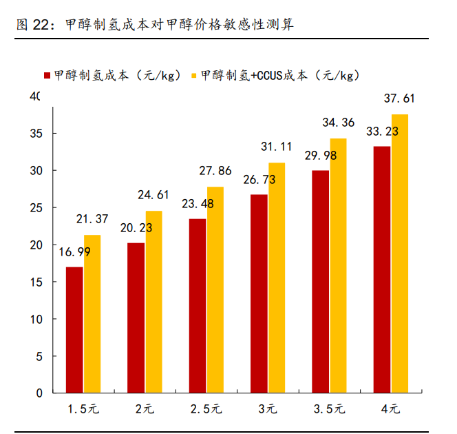 4)固体聚合物阴离子交换膜电解水制氢(AEM) AEM(Anion Exchange Membrane)是固体聚合物阴离子交换膜水电解的简称。AEM电解水设备运行时,水从阴极参与还原反应生成氢气和氢氧根离子,氢氧根离子通过聚合物阴离子交换膜到达阳极参与氧化反应生成氧气和水。AEM综合了碱性电解水技术和PEM电解水技术的优势,较碱性电解水技术响应速度更快、电流密度更高,较 PEM 电解水技术制造成本更低。 AEM电解水技术研发示范项目较少。AEM电解水技术是目前较为前沿的电解水技术之一, 在世界范围内仅有少数公司在尝试将其商业化,相关应用及示范项目也极少。Enapter公司是少数生产出商业化AEM制氢设备的企业,2021年推出AEM电解水制氢系统,系统由420个制氢模块组成,制氢规模达到0.5Nm3/h,同年开始 AEM 产线建设,每月可产 1 万台 AEM 水电解标准化模块。2023年初,国内卧龙集团与 Enapter 公司在意大利签署合作备忘录,将在中国同步开展氢电解槽及相关业务。国内在 AEM 制氢领域布局的公司相对较少,北京未来氢能科技和稳石氢能是其中比较有代表性的企业。 2.1.5 不同技术制氢技术路线成本对比 1)煤制氢的成本测算——单位成本约 11 元/kg,考虑碳捕集 20 元/kg 煤制氢的主要影响因素为煤炭的价格,当褐煤价格为 600 元/吨时,煤制氢的成本约为 11 元/kg,此时煤炭成本约占总成本 41%。煤制氢成本测算的关键假设如下:1. 制氢规模:假设制氢装置规模为90000m³/h。 2. 总投资:建设投资共 13.5 亿元,折旧年限10年,折现率0%,年修理费3%,采用线性折旧。3. 煤炭成本:煤炭不含税价格为 600 元/吨,假设每立方米氢气所需煤炭为 0.67kg。 4. 其他原料成本:假设氧气外购价格 0.6239 元/m³,电价 0.5 元/度;假设每立方米氢气所需氧气 0.42m³,电 0.048 度。 5. 人工费用:10 人,每人每年工资费用 12 万元。 经测算:在煤炭价格为 600 元/吨的情况下,煤制氢成本约为 10.94 元/kg,此时煤炭成本约占总成本 41%。煤炭价格区间 450-700 元/吨时,煤制氢成本变化区间 9.81-11.69 元 /kg。CCUS碳捕集成本为 375 元/吨,制备1kg氢气对应约24kg二氧化碳排放,增加成本9元/kg。考虑 CCUS 碳捕集成本后,成本变化区间为 18.81-20.69 元/kg。 2)天然气制氢成本测算——单位成本约 15 元/kg,考虑碳捕集 19 元/kg 天然气制氢的主要影响因素为天然气的价格。当天然气价格为 2.5 元/ m³时,天然气制氢的成本约为 15 元/kg,此时天然气成本约占总成本的74%。天然气制氢成本测算的关键假设如下:1. 制氢规模:假设制氢装置规模为3000m³/h。2. 总投资:建设总投资共2400万元,折旧年限20年,残值率 5%,年修理费3%,采用线性折旧。3. 天然气成本:假设天然气不含税价格 2.5 元/m³,假设每立方米氢气所需天然气为0.4m³,对应每千克氢气生产需要天然气成本11.2元。4. 其他原料成本:假设去离子水价格 0.04 元/kg,电价 0.5 元/度,冷却水价格为 0.003 元 /kg;假设每立方米氢气所需去离子水 1.3kg,电0.35度。5. 人工费用:10 人,每人每年工资费用 12 万元。 经测算:在天然气价格为 2.5 元/m³的情况下,天然气制氢成本约为 15.21 元/kg,此时天然气成本约占总成本 74%。天然气价格区间为 1.5-4 元/m³时,天然气制氢成本变化区间10.73-21.93 元/m³。CCUS碳捕集成本为 375 元/吨,制备1kg 氢气对应约 11.675kg 二氧化碳排放,增加成本 4.38 元/kg;考虑 CCUS 碳捕集成本后,成本变化区间为 14.13-25.33 元/kg。 3)甲醇制氢成本测算——单位成本约 23 元/kg,考虑碳捕集 28 元/kg 甲醇制氢的主要影响因素为甲醇的价格。当甲醇价格为 2.5 元/ kg 时,甲醇制氢的成本约为 23 元/kg,此时甲醇成本约占总成本的69%。甲醇制氢成本测算的关键假设如下:1. 制氢规模:假设制氢装置规模为2600m³/h。 2. 总投资:建设总投资共 4680 万元,折旧年限 20 年,残值率 5%,年修理费 3%,采用线性折旧。3. 甲醇成本:假设甲醇不含税价格 2.5 元/kg,假设每立方米氢气所需甲醇为 0.58kg,对应每千克氢气生产需要甲醇成本 16.24 元。4. 其他原料成本:假设除盐水价格 0.04 元/kg,电价 0.5 元/度,冷却水价格为 0.003 元 /kg;假设每立方米氢气所需除盐水 0.375kg,电 0.7 度。 5. 人工费用:10 人,每人每年工资费用 12 万元。 经测算:在甲醇价格为 2.5 元/kg 的情况下,甲醇制氢成本约为 23.48 元/kg,此时甲醇成本约占总成本 69%。甲醇价格区间为1.5-4 元/kg 时,甲醇制氢成本变化区间 16.99-33.23 元/kg。CCUS碳捕集成本为 375 元/吨,制备1kg 氢气对应约 11.675kg 二氧化碳排放,增加成本 4.38 元/kg;考虑 CCUS 碳捕集成本后,成本变化区间为 21.37-37.61 元/kg。
