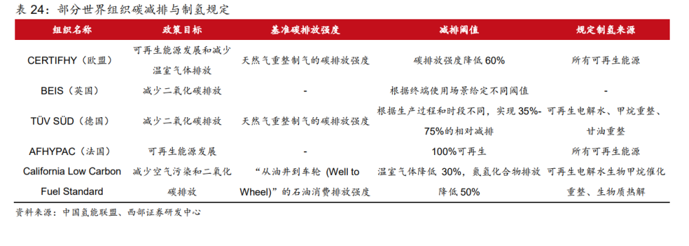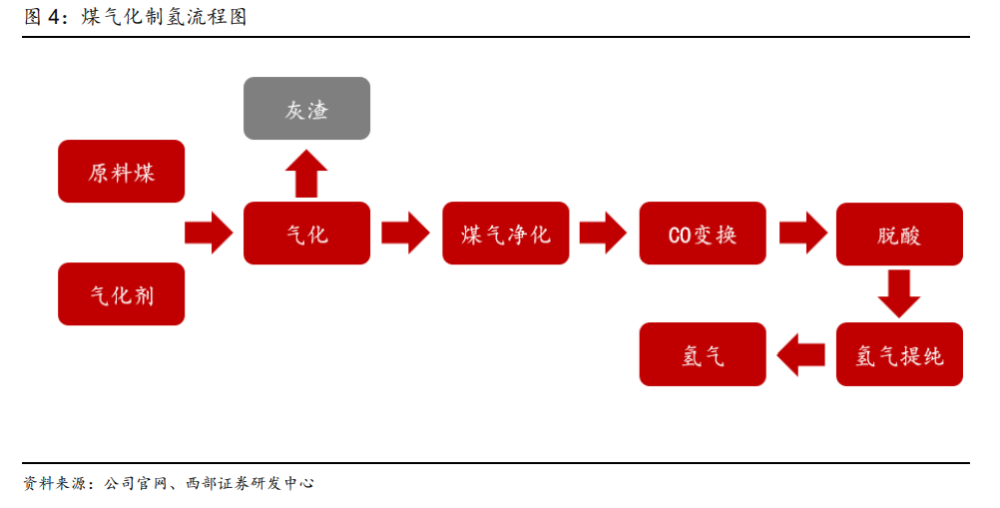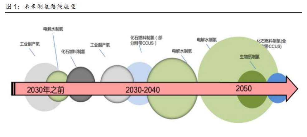 1.2.2 美国:发展路线明确,绿氢补贴丰厚 美国设定氢能长远发展目标,加强氢能全产业链技术储备,多项政策为其保驾护航。美国从1990年开始制定各项政策为氢能发展提供方向,并通过拨款研发费用、提供税收抵免等方式大力发展氢能产业。2022年11月美国能源部发布《国家清洁氢能战略和路线图 (草案)》提出到2050年清洁氢能将贡献约10%的碳减排量,到2030、2040和2050年美国清洁氢需求将分别达到 1000、2000 和 5000 万吨/年。同时美国还通过了《通胀削减法案》(IRA)和《两党基础设施法》(BIL)。IRA 为每公斤绿氢提供 3 美元的补贴,降低制氢成本;BIL 提供给 100 亿美元构建和完善氢能产业链各环节。 1.2.3 日本:政策导向明确,政企、科研合力推动氢能产业化 在保证本国能源安全的前提下,构建全球氢能产业链。日本最早从1973年开始氢能的相关研究,并于2013年将氢能发展上升为国策,2014年提出“氢能社会”的概念。2017年,日本发布的《氢能源基本战略》成为世界上首个国家层面的氢能发展政策,设立了在2030年左右建造商业规模的氢能产业链的目标。根据2019年修订的《氢能和燃料电池发展战略路线图》,计划未来10年投入3700亿日元扶植氢能产业;到2030年实现氢能年供应量300万吨,2050年实现氢能年供应量达到2000万吨。而日本逐渐意识到,氢能产业链的构建仅靠本国有限的资源难以实现。因此2021年《第六次能源基本计划》提出,建立国际氢能供应链,在全球范围内不断创造氢能需求。随着氢能战略的不断修改完善,发展方向愈加明晰,引导政府部门、企业和研究机构大力推进氢能发展利用。 1.2.4 欧洲:氢能将高速增长,战略目标宏伟 大规模部署绿氢,能源结构改革,实现脱碳经济。2020年欧盟发布的《欧洲氢能战略》,提出了未来30年渐进式的氢能发展路径,并将战略分成三个阶段,旨在2030年实现绿氢年产量超1000万吨,2050年前实现氢能的大规模部署以及应用,并让各行业实现脱碳。而俄乌冲突的发生使欧洲能源价格激增,加快了欧洲各国在氢能产业上的进程。欧盟于2022年发布的“Repower EU”计划,再次强调了在2030年氢能产量要实现每年1000万吨国内可再生氢能的生产和1000万吨绿氢进口的目标,并于2023年通过可再生能源指令要求的两项授权法案,推动氢能产业的发展。与此同时,为了解决制氢成本高等问题,欧盟专门成立了欧洲氢能银行,并投资 30 亿欧元助力欧洲氢能的发展。 欧盟各国相继颁发国家氢能战略,德法等五国集体解锁绿氢产能。在《欧洲氢能战略》颁布后几个月内,德国、法国、意大利等国相继发布《国家氢能战略》,对未来氢能产业、燃料电池产业等设立政策框架和目标。德国通过《国家氢能战略》,不仅计划在 2030 年达到 5GW 的电解槽容量,即 14TWh 的绿氢生产,还积极寻找海外氢能供给,并与多国签订氢能项目合作协议。法国于 2020 年 9 月发布《国家氢计划》,预计在未来 10 年投入 72 亿欧元助力氢能产业研发生产,致力成为全球绿氢产业引领者。法国、德国、荷兰、葡萄牙和西班牙在内的五个欧盟成员国的整体目标是,到 2030 年在低生产情景下达到 20.5GW 的绿氢产能,在高生产情景下达到 22GW 的绿氢产能,共同助力欧洲氢能战略的完成。 二、产业链:制氢环节是核心,储运及应用环节快速发展 氢能产业链分为上游制氢环节,中游储运氢环节以及下游应用环节。对于上游制氢环节而言,电解槽是核心装置,电解槽厂商也是行业内主要玩家,本报告对上游目前主要制氢路径以及成本进行了详细梳理和拆分,电解水制氢目前成本仍然偏高,但是考虑未来碳税的征收以及绿氢成本持续降低,绿氢与灰氢成本差距有望逐步收敛。随着氢能产业链的发展, 氢能储运如储氢瓶、氢能压缩机、氢能阀门,下游氢燃料电池企业、氢能自行车等领域均 迎来较大的发展机遇,值得长期关注。 2.1 上游:制氢环节 灰氢成本优势明显,绿氢零碳排放具备发展潜力。目前氢气的制备主要技术工艺有热化学制氢和水电解制氢,其中热化学制氢技术主要有化石能源制氢及化工原料制氢。化石能源制氢包括水煤气制氢、天然气重整制氢等,目前已经进行工业生产,技术相对成熟,但用此法制氢发电,能量转换效率低,经济性差,CO2排放量大。根据中国氢能联盟研究院研究显示,2019 年我国氢气生产中有超过 60%的氢气是煤制氢。在未来一段时期内,由于资源禀赋和新制氢技术尚未成熟,煤制氢仍是我国氢气的主要来源。 2.1.1 煤制氢 以煤为原料制氢气的方法主要有两种: 一是煤气化制氢。煤气化是指在高温常压或高温高压条件下,煤与水蒸气或氧气(空气) 反应转化为以氢气和CO为主的合成气,再将 CO 经水气变换反应得到氢气和 CO₂的过程。煤气化制氢工艺成熟,目前已实现大规模工业化。传统煤制氢采用固定床、流化床、 气流床等工艺,碳排放较高。二是煤超临界水气化制氢,是新型煤制气工艺。超临界水气化过程是在水的临界点以上(温度大于647K,压力大于22MPa)进行煤的气化,主要包括造气、水气变换、甲烷化三个变换过程。可以有效、清洁地将煤转换为H2和纯二氧化碳。2022年8月南控集团下属景隆公司与新锦盛源公司签约开展煤炭超临界水气化制氢项目合作。