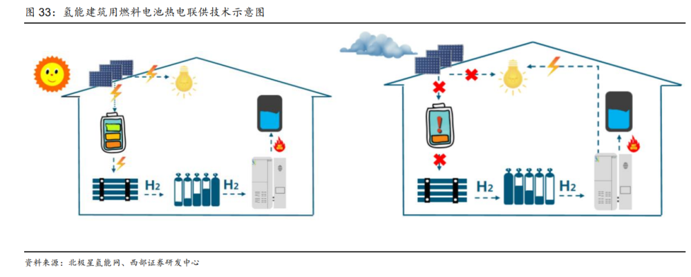 全球氢能市场前景可观,规模有望持续增长。全球氢能需求自 2000 年以来强劲增长,2020 年全球氢气需求大约为 9000 万吨。根据预测,到2030年,全球氢气产量将从 2021 年的 9400 万吨增长至 1.43 亿吨,并于 2050 年突破 6.6 亿吨。其中我国氢气产量预计在 2030 年达到 4361 万吨,占世界总产量的 30%。 氢能需求主要集中于精炼环节和工业用途。2020年精炼环节消耗3,840万吨的氢气作为原料,并且氢气也满足一部分燃料需求。在工业合成领域,2020年氢气消耗量超 3000 万吨,大部分作为原料使用。据 IEA 的预测,2050 年燃料电池、能源发电和合成燃料的 需求将成为未来氢能应用的重要领域,氢能消耗将分别占到全球氢能总需求的 23.2%, 19.2%和 14.2%,精炼环节和工业合成领域,在 2050 年将下滑至 5.9%、21.9%,氢能其它领域的应用仍有较大发展潜力。 传统合成氨、甲醇等化工产品利用煤气化产生的氢气合成,而煤气制氢过程碳排放约14kg.CO2/kg.H2,通过利用风力、太阳能等可再生能源电解水,能够实现零碳排放制氢, 推动化工行业脱碳生产。《关于“十四五”推动石化化工行业高质量发展的指导意见》明确提出,要发展“以气代煤”燃料格局,增加富氢原料比重,合理开发利用缘氢,推进炼化、煤化工与“绿电”、“绿氢“等产业耦合示范。 到 2050 年含钢铁、化工的工业领域氢能消费总量将超过 1.6 亿吨标准煤。工业领域氢能消费增量主要源自钢铁行业。根据中国氢能联盟预测,到2030年钢铁领域氢能消费量将超过 5000 万吨标准煤,到 2050 年进一步增加到 7600 万吨标准煤,将占钢铁领域能源消 费总量的 34%。 氢建筑应用仍处于导入阶段,未来存在较大市场空间。氢能建筑,是近年发展起来的一种绿色建筑新理念。它以氢能完全或部分替代市政电网、天然气等传统能源,满足建筑对冷、热、电、生活热水等各种能源的需求,在提高建筑用电可靠性的同时,还有助于优化国内的能源结构、降低电网整体投资和减少问题气体排放。 目前全球建筑供热和电力需求约占全球能源需求的1/3。全球多个国家积极探索氢能在建筑领域应用,利用氢气通过发电、直接燃烧、热电联产(CHP)等形式为居民住宅或商业区提供电热水冷多联供。如氢可与天然气混合(氢气掺混比例为0~20%),通过基于燃气 轮机或燃料电池的CHP 技术,利用现有建筑和能源网络基础设施提供灵活性和连续性的热能、电力供应,从而取代化石燃料CHP。此外,100%的纯氢可通过氢锅炉用于建筑供热,但氢气价格需低至1.5~3.0美元/kg时,才能与天然气锅炉和电动热泵竞争。而对于分布式供暖,氢能是少数几种可以与天然气竞争的低碳替代品,随着制氢成本和氢锅炉、 燃料电池成本的下降,以及氢气利用现有天然气管道输送能力的提升,预计到2030年, CHP中氢锅炉与氢燃料电池的成本为900~2000美元/(户·年),建筑热电联供的氢能需求量为 3 万~ 9 万 t/年。