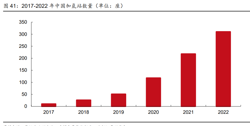 启动燃料电池汽车示范城市,氢车蓄势待发。2021 年 8 月和 12 月,我国分两批批复了氢燃料电池汽车示范城市群名单,名单包含上海、京津冀、广东、河南、河北五大城市群, 有 41 座城市被纳入其中。这五大城市群分别由上海市、北京市、佛山市、张家口市以及郑州市牵头,形成自上而下,以点带面的发展动能。2023 年 3 月 28 日,在北京氢能产业大会暨京津冀氢能产业发展高峰论坛上,科学技术部高新技术司能源与交通处处长问斌表示:“当前,全国五大燃料电池汽车示范城市群运行考核良好,氢能产业布局呈现遍地开花局势。”我国氢能产业处于发展初期,但是在政策的驱动下,氢能产业快速发展,燃料电池汽车产业链雏形初步形成,基本掌握部分关键技术,产业发展前景广阔。 国家及地方政府积极出台氢能产业发展支持政策。2022 年 3 月,国家发改委发布的《氢能产业发展中长期规划 (2021-2035 年)》,要求统筹氢能产业布局,提高氢能在能源消费结构中的比重,到 2025 年实现燃料电池车保有量约 5 万辆。为推动我国氢能产业发展, 北京、广东、上海等省份也纷纷发布氢能产业发展规划,从推广电动汽车到交通领域,到推广燃料电池车到交通领域,从加氢站到燃料电池系统再到燃料电池车的推广形成了一条龙的政策体系。从规划来看,燃料电池汽车和加氢站发展前景值得期待。 加氢站布局加快,逐渐形成网络。加氢站等基础设施是否完善是影响消费者购买氢燃料电池汽车热情的主要因素。随着国内氢燃料电池汽车累计销量增加,中石化、中石油等能源央企不断加大加氢基础设施的投资和建设力度,国内加氢站数量呈现快速增长趋势。截至 2022 年底,我国加氢站累计建成数量达到 274 座。根据 2020 年中国汽车工程学会发布的《节能与新能源汽车技术路线图 2.0》相关规划,到 2035 年加氢站的建设目标为至少 5000 座,中国未来加氢基础设施的市场规模在 2030-2050 年将突破千亿。此外,我国加氢站建设参与主体呈现多样化趋势,采取规模化建设或加油/加氢/加气站合建等方式来拓展加氢基础设施网络,单位加注成本也有望下降。