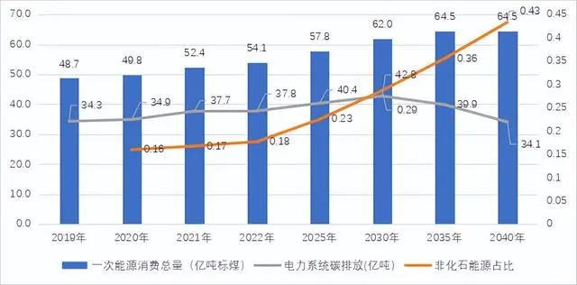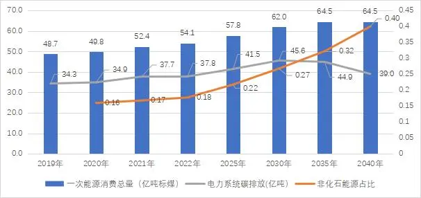 按风电、光伏年均增量基本保持合理考虑,兼顾新能源产业产能发展及国民经济发展的用能需求,以及到2060年非化石能源占比将达到80%以上的办界条件,我们按基础场景和对比场景两个场景对2040年的能源消费总量和结构进行分析,其主要结论如下。 基础场景:非化石能源占比2030年至2060年年均匀速按1.83%增长,至2040年为43.3%,2040年风电、光伏装机总规模约为38.6亿千瓦,电力系统碳排放量(不考虑CCUS)将在2030年达到峰值、峰值为42.8亿吨。 对比场景:考虑到非化石能源占比目标先慢后快发展,2030年至2040年非化石能源占比年均按1.5%增长,至2040年为40%,2040年风电、光伏装机总规模约为34.4亿千瓦,电力系统碳排放量(不考虑CCUS)将在2030年达到峰值、峰值为45.6亿吨。