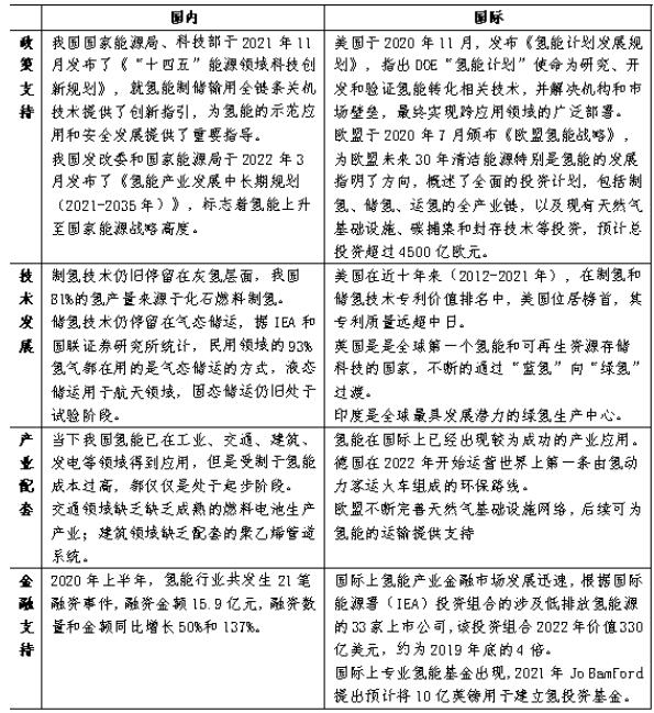 图1 氢能产业链及碳排放水平 资料来源:中央财经大学绿色金融国际研究院整理 相比于国外氢能产业,我国氢能产业生态尚未全面建立,主要存在四方面差异:一是政策支持,我国对于氢能产业的战略布局起步较晚,2020年“双碳”目标提出后才逐步进入市场视野。而国外部分领先国家已率先完成氢能产业的验证、推广及长期规划。二是技术发展,我国在制氢、储运、应用等关键领域仍面临“灰氢”清洁利用的技术瓶颈,而国际相关技术已发展成熟并取得高质量成果,由蓝氢不断向绿氢过渡。三是产业配套,我国氢能相关配套设施及市场转化仍有待建设完善与实践推广,而欧盟等国已成功将氢能投入使用。四是金融支持,金融支持氢能仍未形成完善的服务体系,融资规模较小、品种与来源单一。而国外已出现专业的氢投资基金,氢能行业融资市场正变得更加多元。